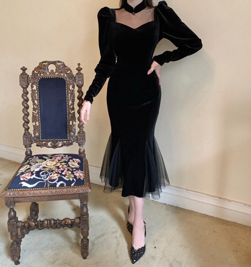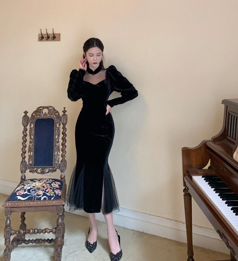ワンピース フレアワンピース ひざ下 長袖 無地 春 秋 冬 フレア 細身 裾フレア レース 透け感 シースルー きれいめ 大人 上品 おしゃれ 大人女子 モード系 エレガント フォーマル ミモレ ボリューム袖 ワンピドレス 黒 ブラック S M L XL 2XL 大きいサイズ 10代 20代 30代 40代 デート お出かけ パーティー イベント 謝恩会 シーズンレス 韓国系 ファッション プチプラ 送料無料 | Rena 韓国ファッション レディースアパレル