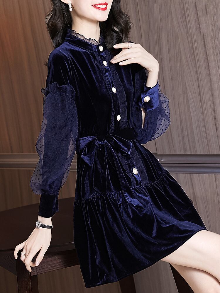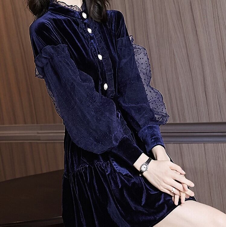 ワンピース Aラインワンピース ミニ丈 長袖 春 秋 冬 レース リボン ウエストマーク かわいい 大人可愛い 大人 上品 おしゃれ 大人女子 ラブリー キュート ガーリー エレガント スタンドカラー ミニ ネイビー M L XL 2XL 3XL 大きいサイズ 10代 20代 30代 学生 通学 デート お出かけ 女子会 パーティー イベント 韓国系 オルチャン ファッション モテ 美脚 脚長 プチプラ 送料無料 | Rena 韓国ファッション レディースアパレル