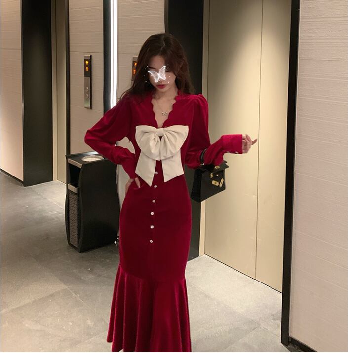ワンピース タイトワンピース ミモレ丈 長袖 無地 秋 冬 スリム タイト 細身 裾フレア リボン かわいい 大人可愛い 大人 上品 おしゃれ かっこいい 大人女子 こなれ感 クール モード系 エレガント Vネック ミモレ ボリューム袖 黒 ブラック 赤 レッド S M L XL 大きいサイズ 10代 20代 30代 40代 デート お出かけ 女子会 パーティー イベント 謝恩会 二次会 韓国系 ファッション スタイル 体系カバー 美脚 脚長 送料無料 | Rena 韓国ファッション レディースアパレル