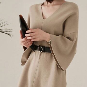 トップスはキレイなVネックにウエストのベルトがきちんと全体を引き締めてくれています。