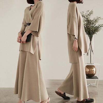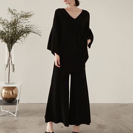 セットアップ レディース ニット ガウチョパンツ ロング丈 七分袖 無地 春 ワイド Iライン かわいい 大人可愛い きれいめ シンプル カジュアル 大人 上品 おしゃれ お洒落 かっこいい レトロ 大人可愛い 大人女子 こなれ感 個性的 エレガント モダン Vネック ロング 袖あり 2点セット 黒 ブラック ベージュ くすみカラー S M L XL 20代 30代 オフィス ビジネス OL 通勤 学生 通学 デート お出かけ 女子会 休日 ファッション コーデ プチプラ 送料無料 トレンド 流行 | Rena 韓国ファッション レディースアパレル