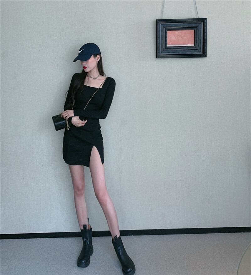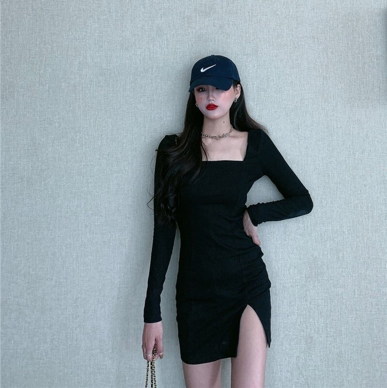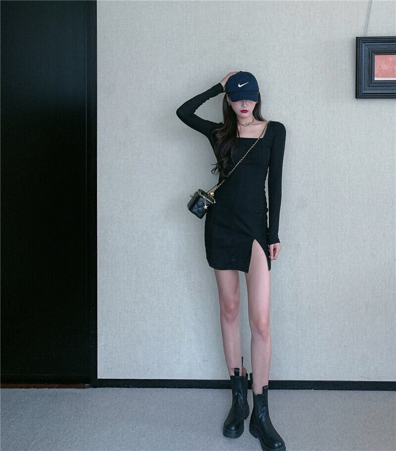 ワンピース タイトワンピース ミニ丈 長袖 無地 春 秋 冬 スリム タイト 細身 きれいめ シンプル カジュアル 大人 上品 おしゃれ かっこいい 大人女子 クール スクエアネック ミニ 白 ホワイト 黒 ブラック モノトーン S M L 10代 20代 30代 40代 学生 通学 デート お出かけ 女子会 パーティー イベント 着回し 普段使い 韓国系 コーデ 美脚 脚長 定番 プチプラ 送料無料 | Rena 韓国ファッション レディースアパレル