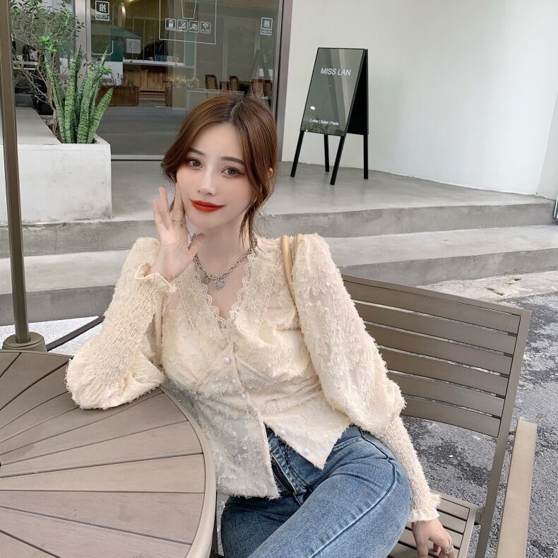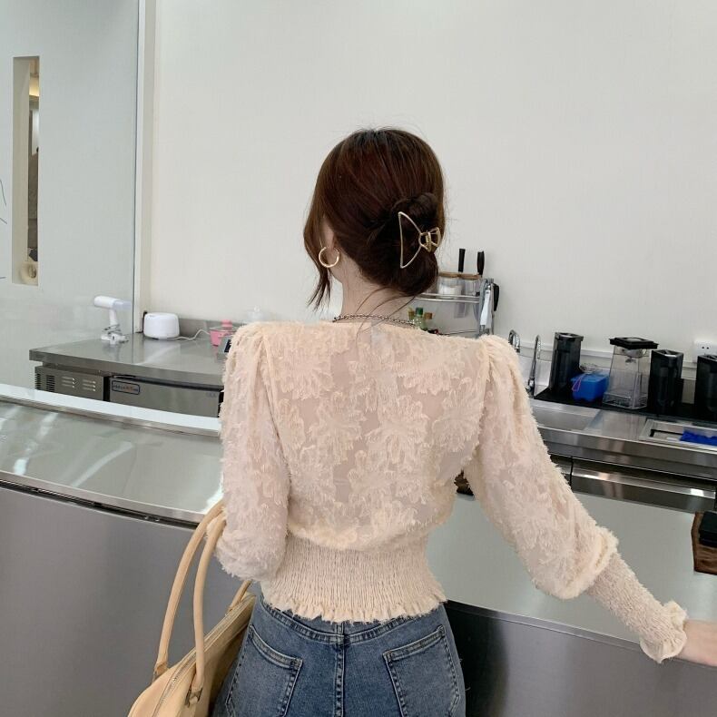 シャツ ブラウス ショート丈 長袖 春 夏 秋 レース 前開き 透け感 シースルー かわいい 大人可愛い きれいめ シンプル カジュアル 大人 上品 おしゃれ 大人女子 ラブリー キュート ガーリー Vネック 袖あり オフホワイト S M 10代 20代 30代 40代 OL 通勤 学生 通学 デート お出かけ 女子会 着回し 普段使い 韓国系 ファッション コーデ スタイル モテ プチプラ 送料無料 | Rena 韓国ファッション レディースアパレル