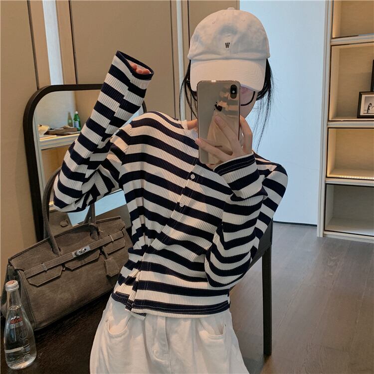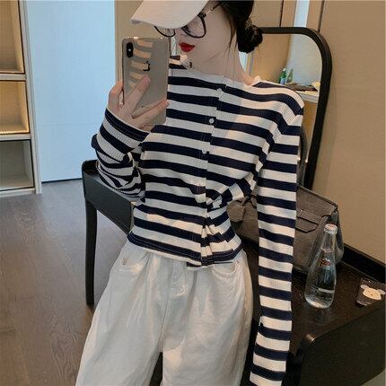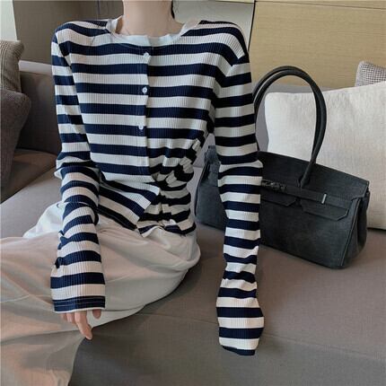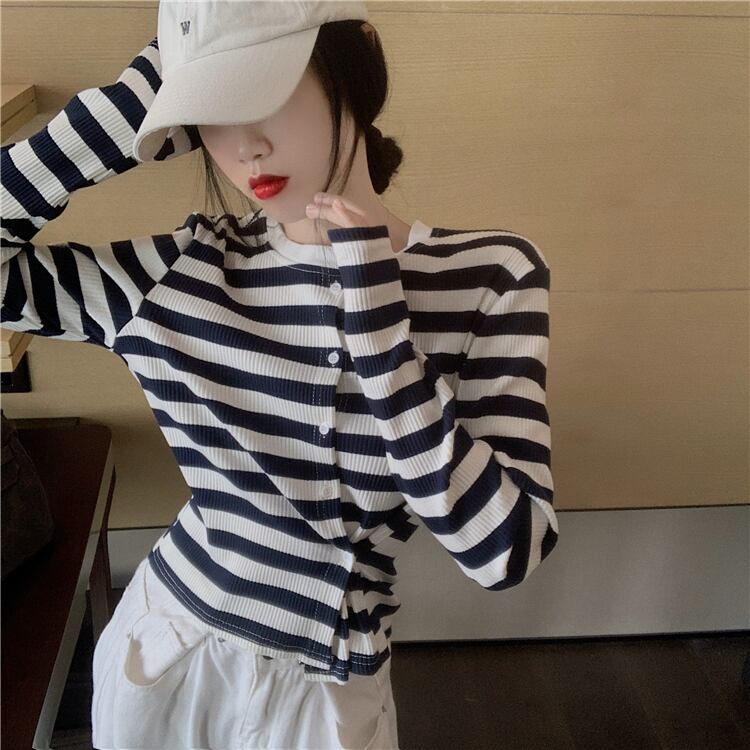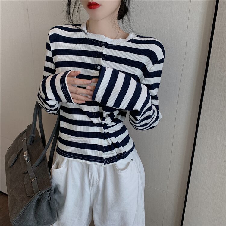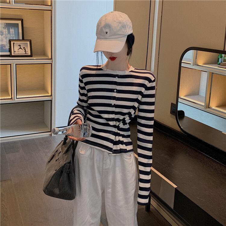 トップス レディース カーディガン 長袖 柄 ボーダー 春 秋 ストレート 前開き スリット かわいい 大人可愛い きれいめ シンプル カジュアル 大人 上品 おしゃれ お洒落 レトロ 大人可愛い 大人女子 ラフ 個性的 クルーネック 袖あり くすみカラー 大人カラー ベイクドカラー S M L XL 20代 30代 学生 通学 デート お出かけ 女子会 休日 着回し 普段使い 韓国 韓国系 オルチャン ファッション コーデ スタイル 楽ちん モテ 送料無料 トレンド 流行 インスタ映え | Rena 韓国ファッション レディースアパレル