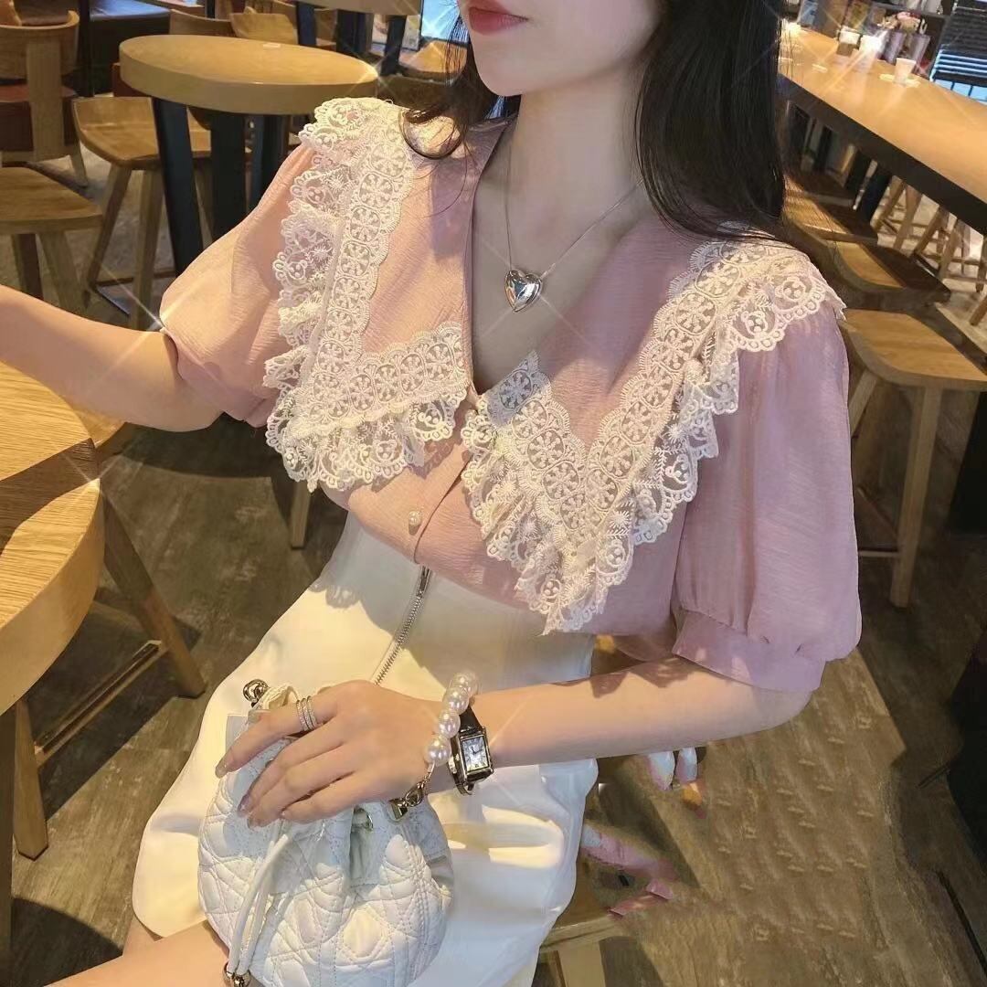 優しい色合いが特徴的な、レース襟のブラウスです。