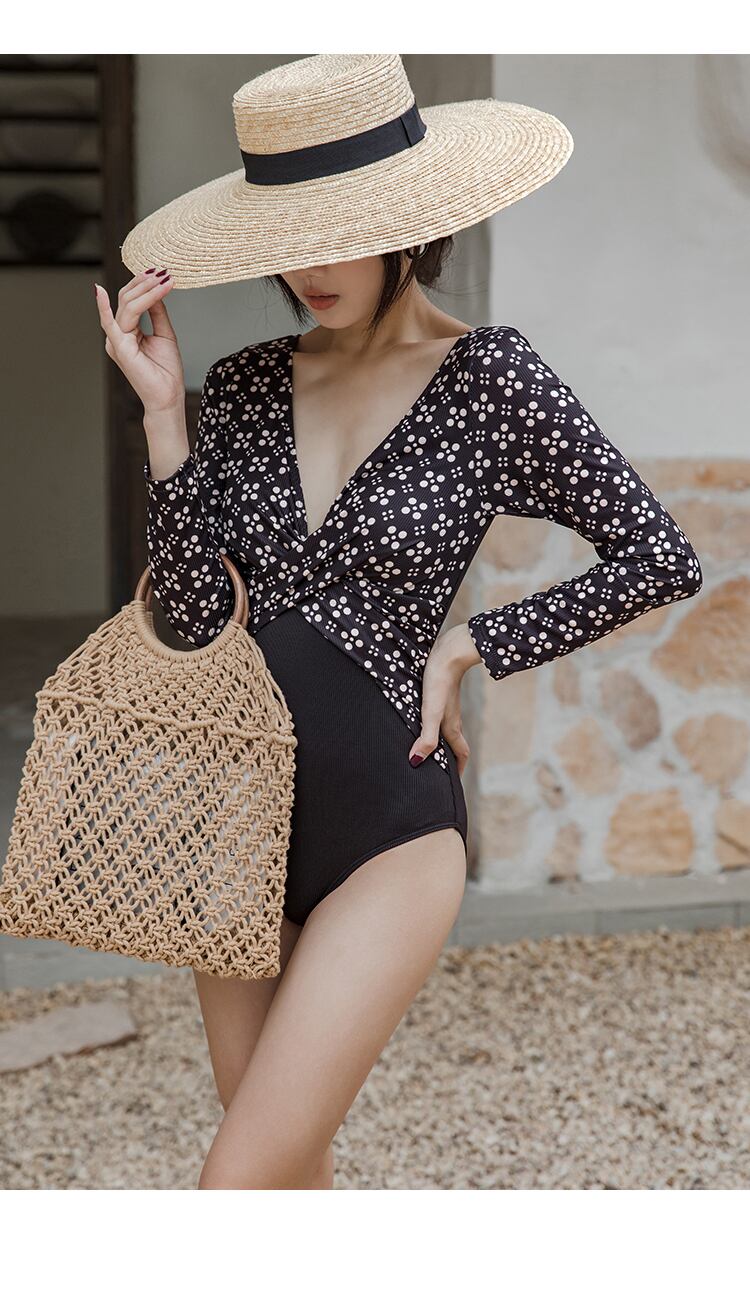 レディース 水着 スイムウェア ワンピース水着 ワンピース ホルターネック パッド付き 長袖 切り替えデザイン 谷間魅せ かわいい 大人可愛い セクシー 華やか 大人っぽい おしゃれ レトロ 主役級 存在感 キュート 個性的 クール モダン M L XL 大きいサイズ プリント 10代 20代 30代 40代 夏 海 ビーチ プール リゾート 旅行 美脚 脚長 スタイルアップ 高見え 送料無料 | Rena 韓国ファッション レディースアパレル