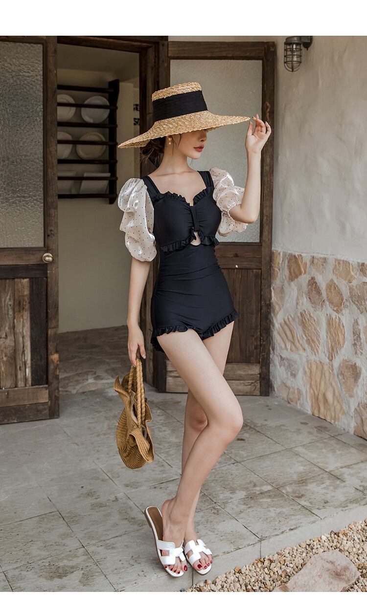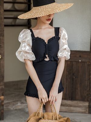 ふんわりとしたパフスリーブが特徴的な、ワンピースタイプのスイムウェアです。