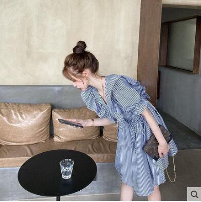 ワンピース フレアワンピース 膝丈 半袖 ストライプ 春 夏 秋 フレア フリル ウエストマーク ウエストリボン かわいい 大人可愛い きれいめ シンプル カジュアル 大人 上品 おしゃれ 大人女子 キュート ガーリー Vネック ひざ丈 S M L XL 大きいサイズ 10代 20代 30代 40代 OL 通勤 学生 通学 デート お出かけ 女子会 着回し 普段使い 韓国系 ファッション コーデ スタイル 送料無料 | Rena 韓国ファッション レディースアパレル