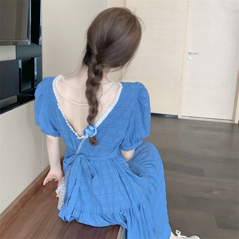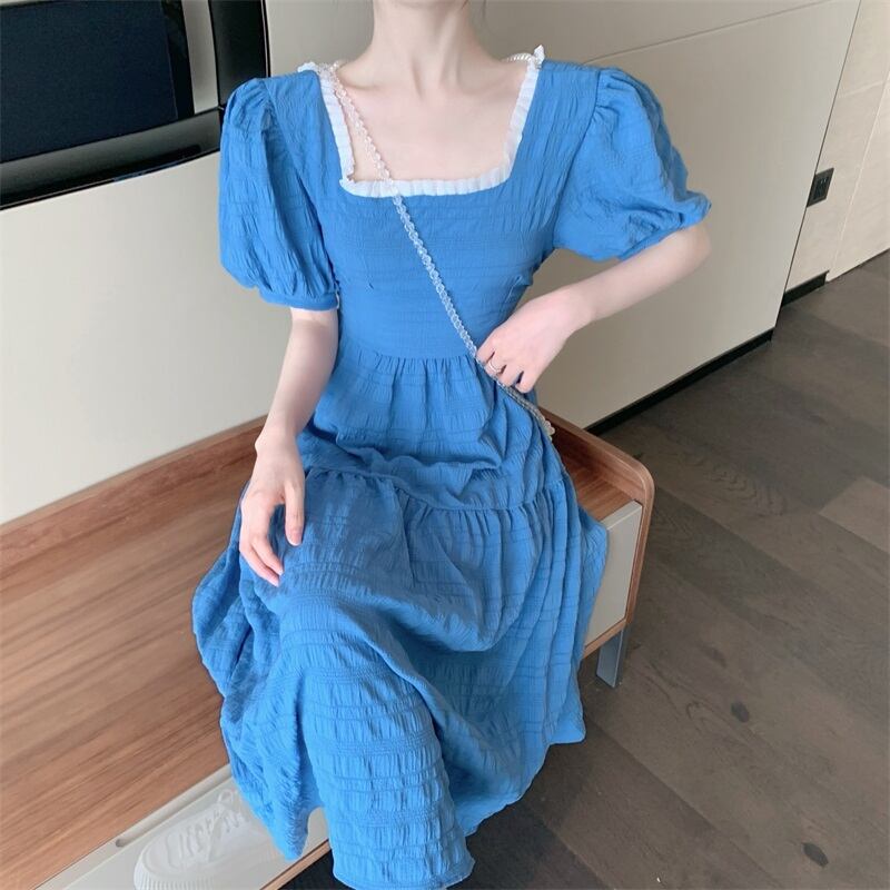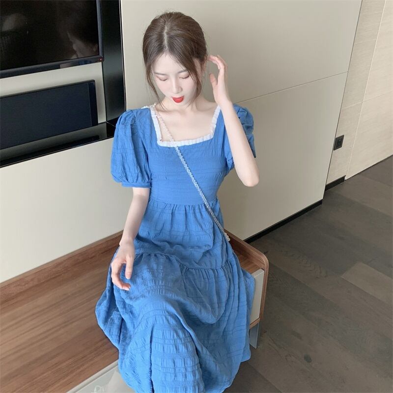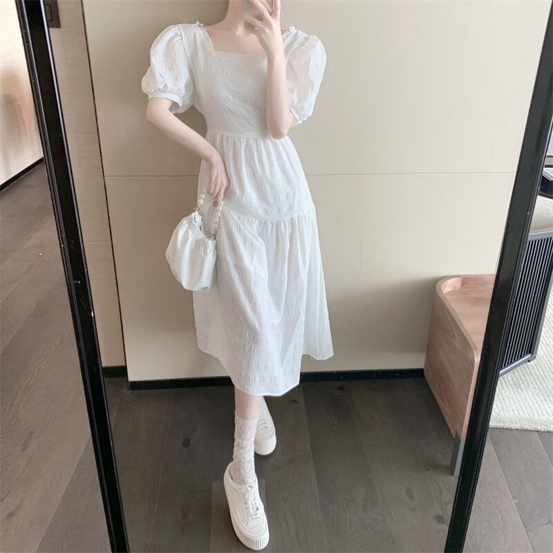 ワンピース フレアワンピース ミモレ丈 半袖 無地 春 夏 秋 フレア フリル ウエストマーク かわいい 大人可愛い きれいめ シンプル カジュアル 大人 上品 おしゃれ 大人女子 ラブリー キュート ガーリー スクエアネック ミモレ 袖あり ボリューム袖 白 ホワイト ブルー 緑 S M L XL 大きいサイズ 10代 20代 30代 学生 通学 デート お出かけ 女子会 お泊まり イベント リゾート 旅行 着回し 普段使い 韓国系 ファッション スタイル 定番 送料無料 | Rena 韓国ファッション レディースアパレル