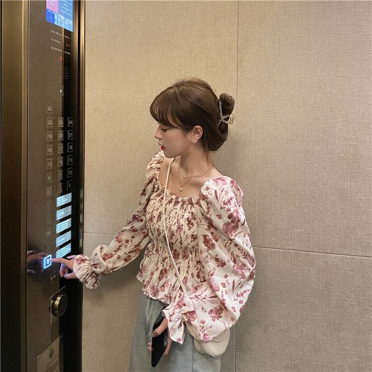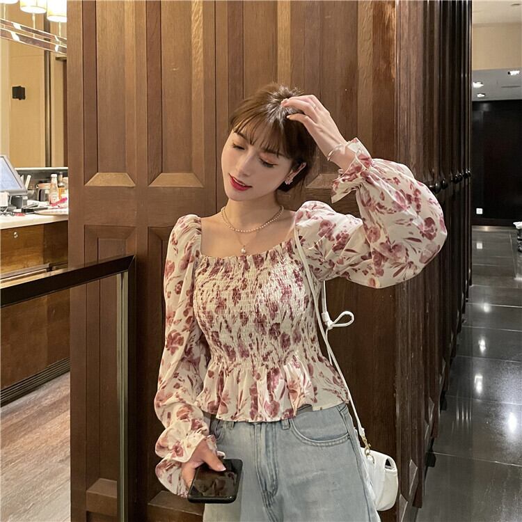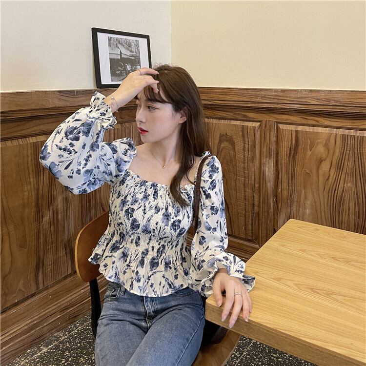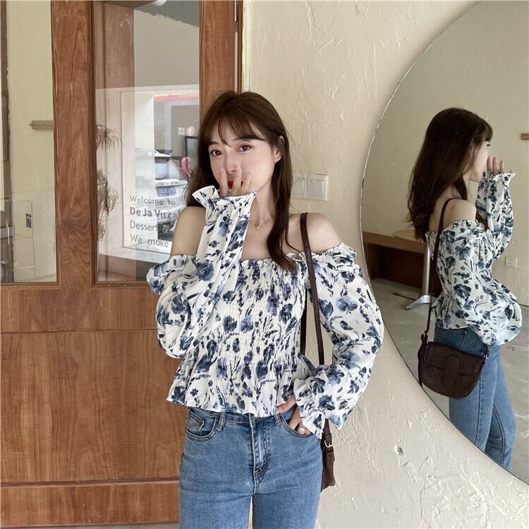 ブラウス ショート丈 長袖 花柄 春 秋 シャーリング 裾フレア かわいい 大人可愛い きれいめ カジュアル 大人 上品 おしゃれ 大人女子 こなれ感 ラブリー キュート ガーリー とろみ感 オフショルダー ボリューム袖 パフスリーブ ブルー グレー ピンク S M L XL 大きいサイズ 10代 20代 30代 40代 学生 通学 デート お出かけ 女子会 パーティー イベント リゾート 着回し 普段使い 韓国系 コーデ モテ プチプラ 送料無料 | Rena 韓国ファッション レディースアパレル