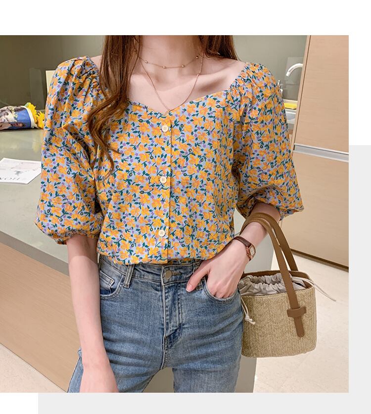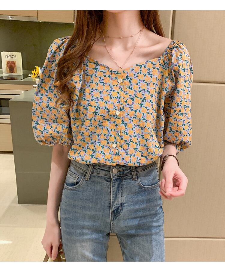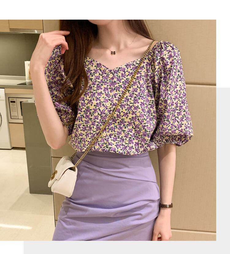 ブラウス ショート丈 五分袖 小花柄 春 夏 秋 シフォン かわいい 大人可愛い きれいめ シンプル カジュアル 大人 上品 おしゃれ 大人女子 キュート ガーリー スクエアネック 5分袖 紫 パープル 黄色 イエロー S M L XL 2XL 大きいサイズ 10代 20代 30代 40代 OL 通勤 学生 通学 デート お出かけ 女子会 パーティー イベント リゾート 旅行 着回し 普段使い 韓国系 ファッション コーデ スタイル モテ プチプラ 送料無料 | Rena 韓国ファッション レディースアパレル