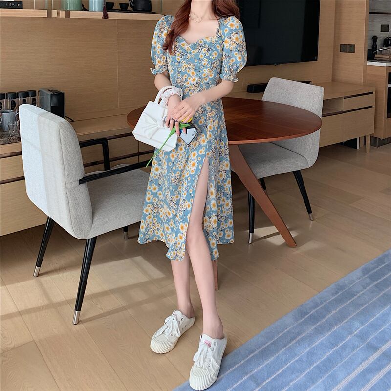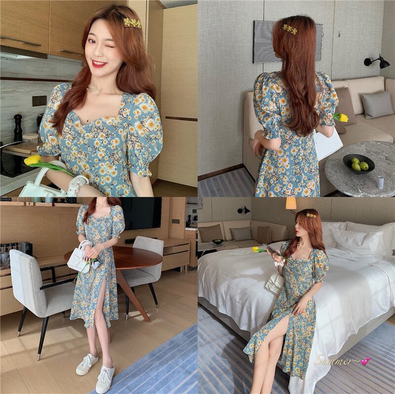 ワンピース Aラインワンピース 膝丈 五分袖 小花柄 春 夏 秋 スリム Aライン スリット サイドスリット かわいい 大人可愛い シンプル カジュアル 大人 上品 おしゃれ 大人女子 ラブリー キュート ガーリー セクシー スクエアネック ひざ丈 5分袖 ボリューム袖 ブルー S M L XL 大きいサイズ 10代 20代 30代 OL 通勤 学生 通学 デート お出かけ 女子会 イベント リゾート 旅行 着回し 普段使い ファッション コーデ モテ 美脚 脚長 送料無料 | Rena 韓国ファッション レディースアパレル