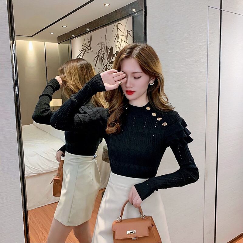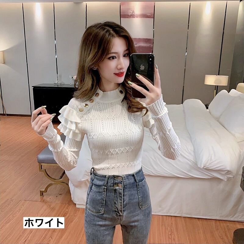 ハーフタートルネックに、袖に施されたフリルがキュートで可愛いニットセーターです。