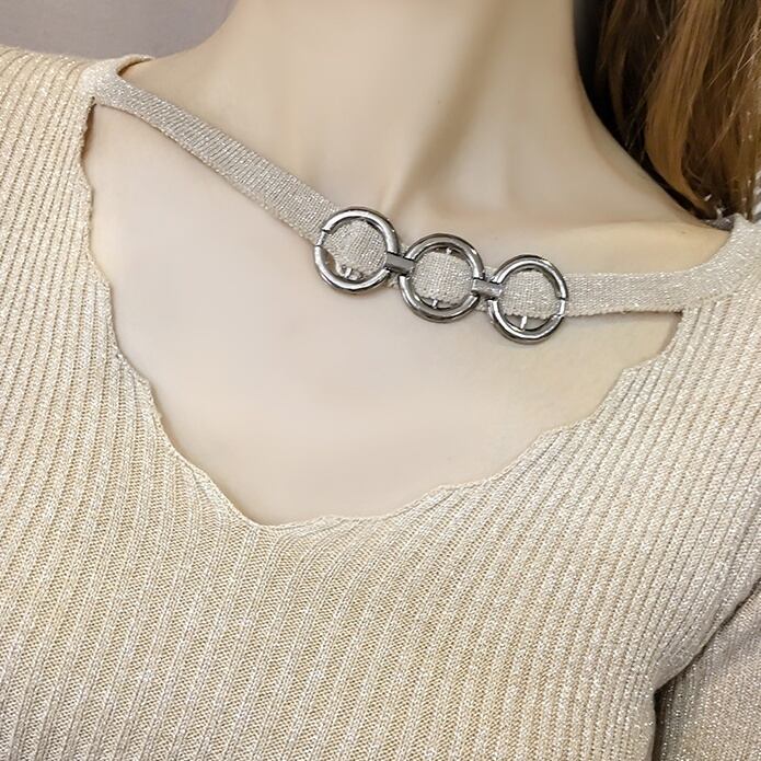 ラメの入った生地に、胸元の飾りがファッショナブルでオシャレなポイントです。