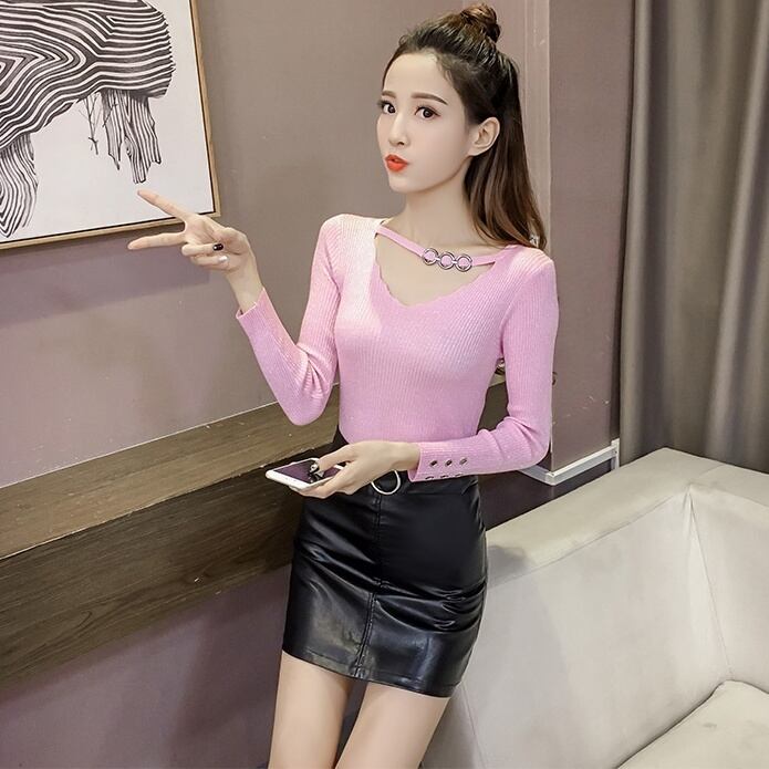 スッキリとあいたVネックに、スリムなシルエットがセクシーで魅力的なトップスです。