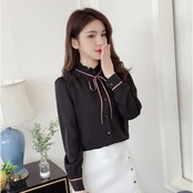 首もとのフリルと、リボンが女性らしく上品なデザインの長袖ブラウスです。