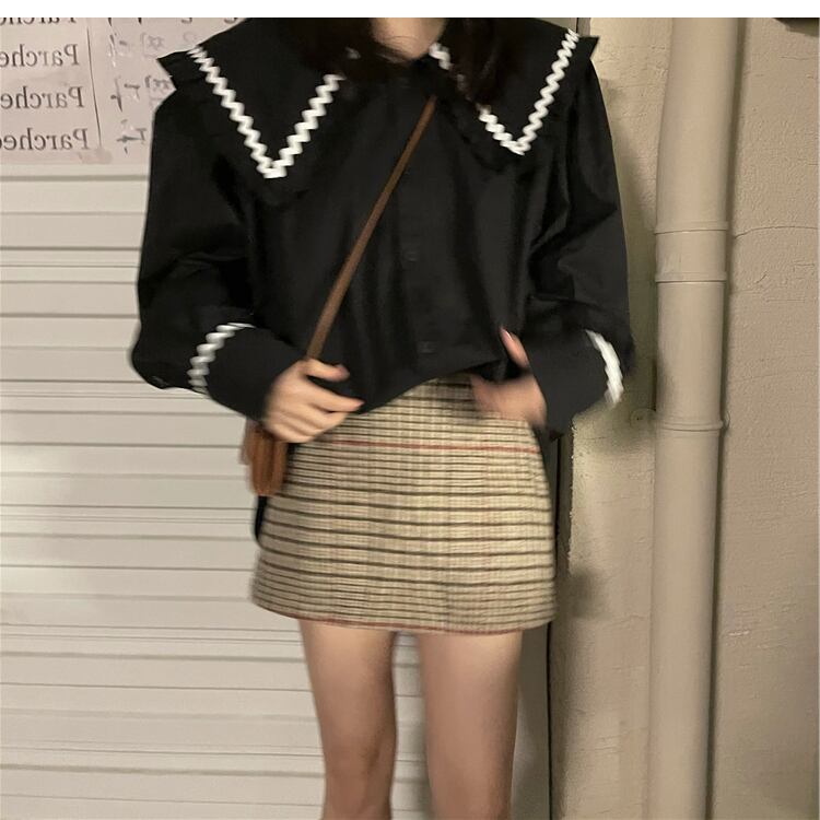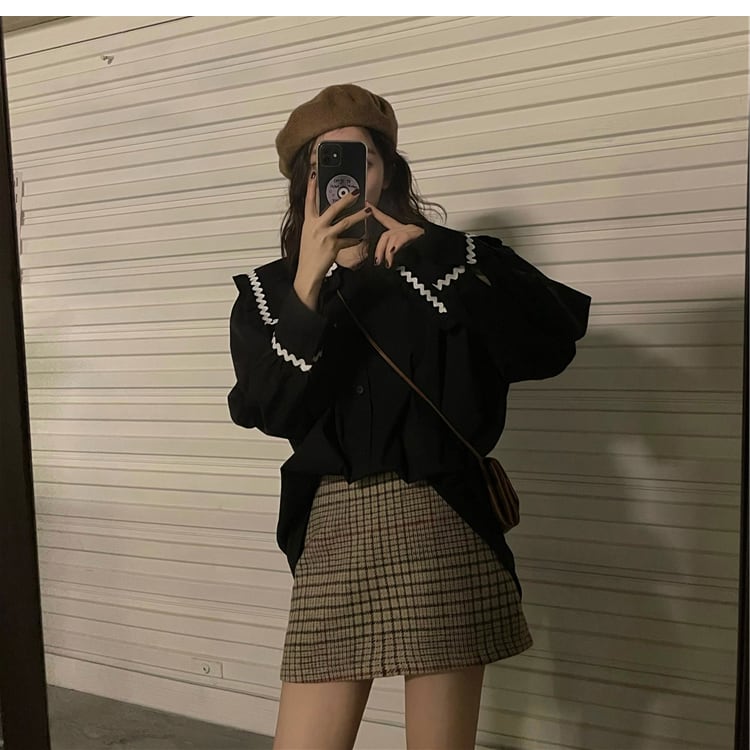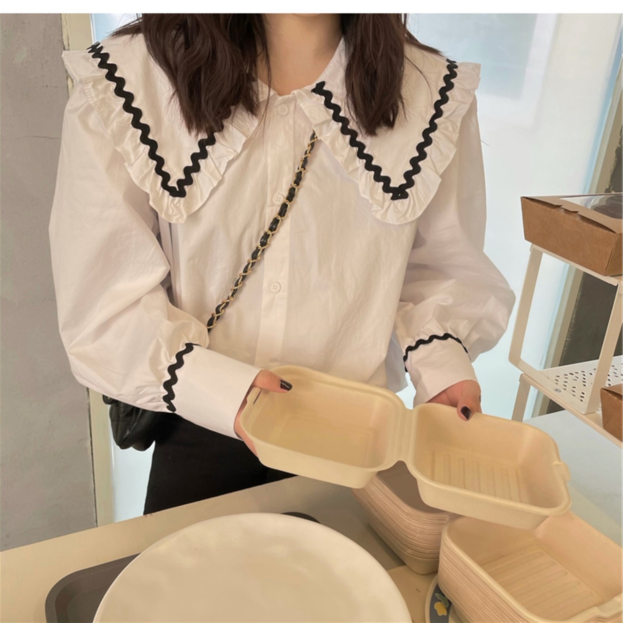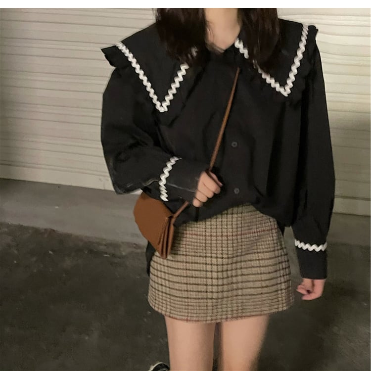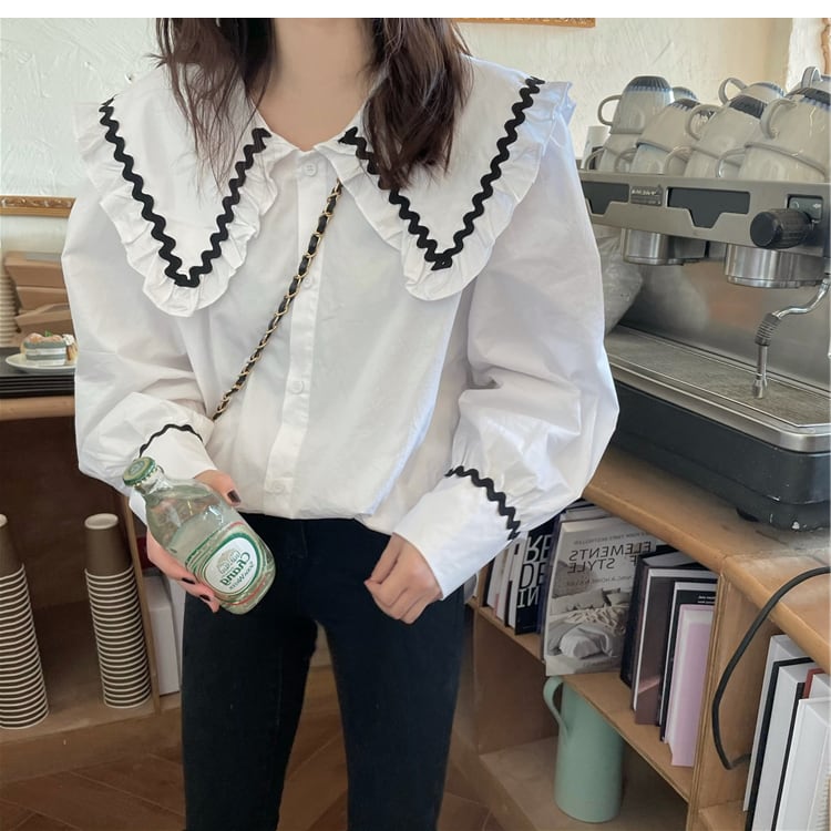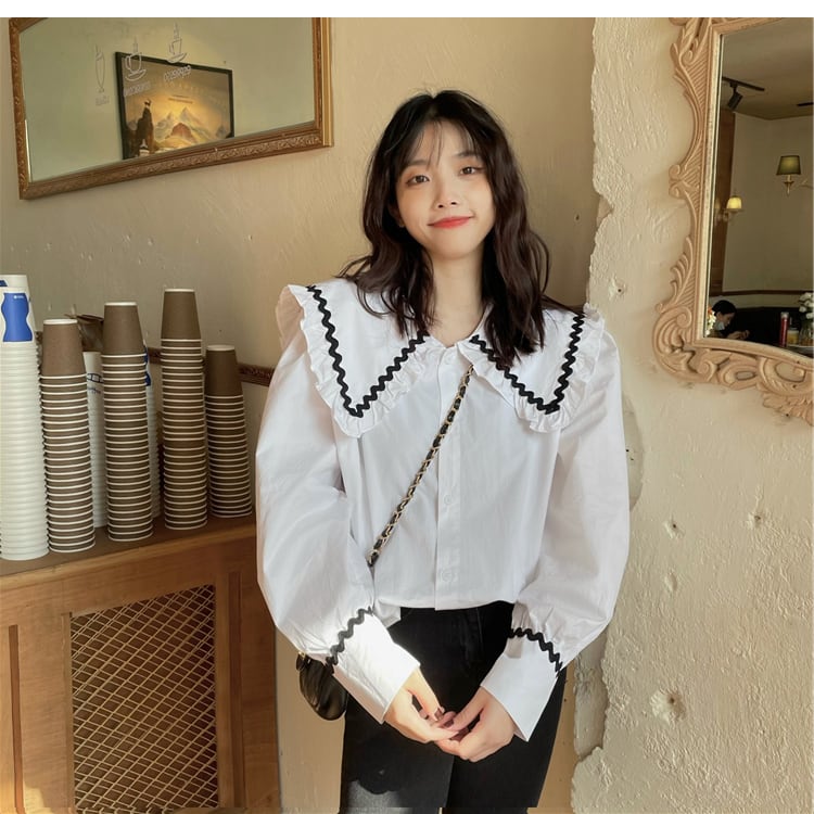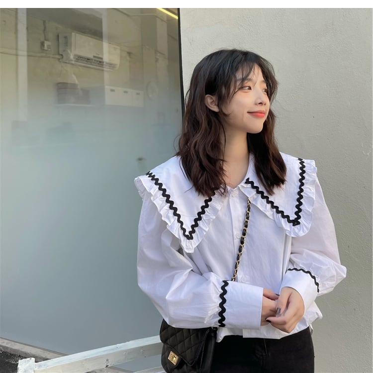印象的な大きな襟に、ゆったりとしたシルエットが可愛い、長袖ブラウスです。