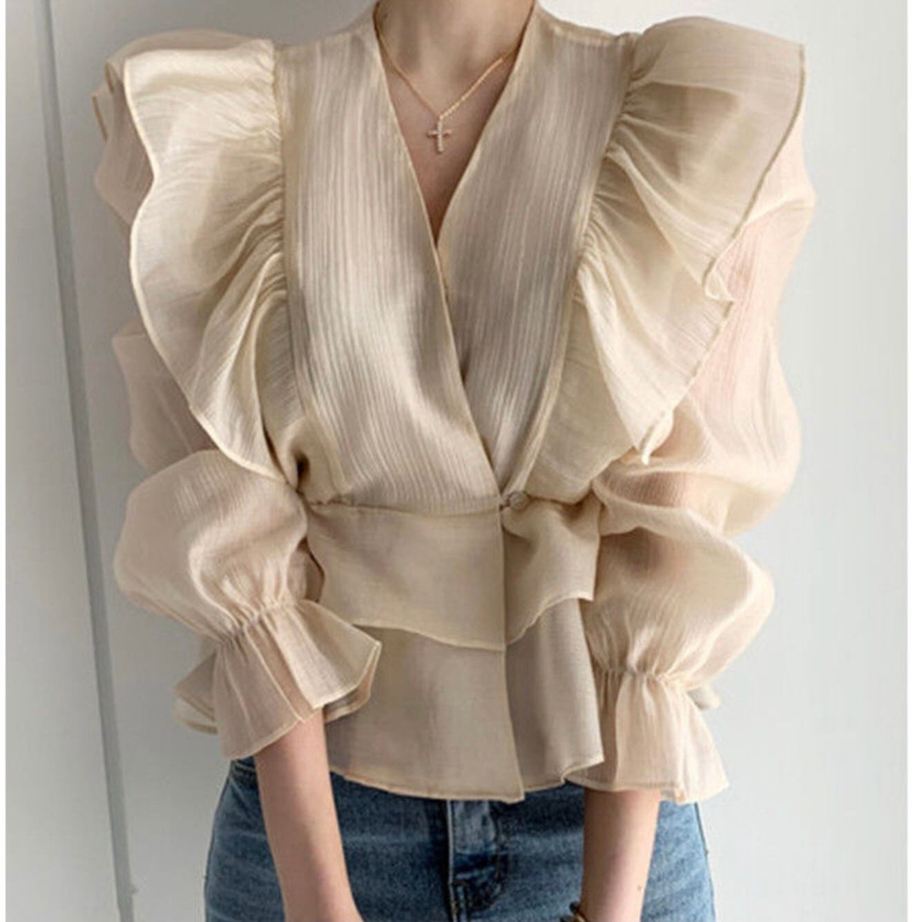 トップス シャツ ブラウス ショート丈 七分袖 無地 春 秋 シフォン フリル 透け感 かわいい 大人可愛い きれいめ シンプル カジュアル 大人 上品 おしゃれ 大人女子 こなれ感 キュート ガーリー 主役級 とろみ感 Vネック ボリューム袖 S M L XL 大きいサイズ 10代 20代 30代 40代 OL 通勤 学生 通学 デート お出かけ 女子会 着回し 普段使い 韓国系 ファッション コーデ モテ 送料無料 | Rena 韓国ファッション レディースアパレル