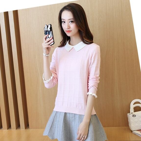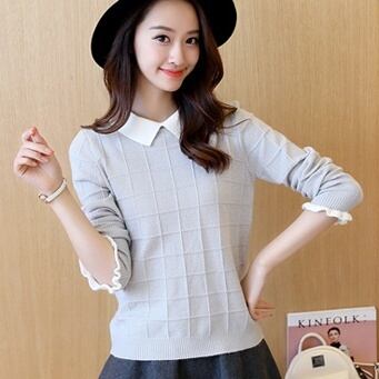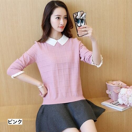 女の子らしく上品な襟と、可愛らしいフリルがついた袖が特徴の長袖セーターです。