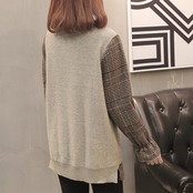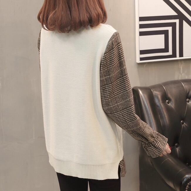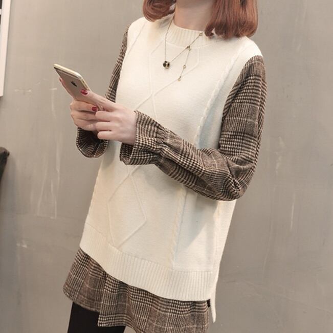 チェックの長袖シャツと、ニットベストが合わさったような、フェイクツーピースのデザインがオシャレなトップスです。