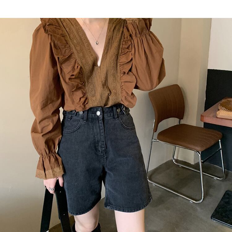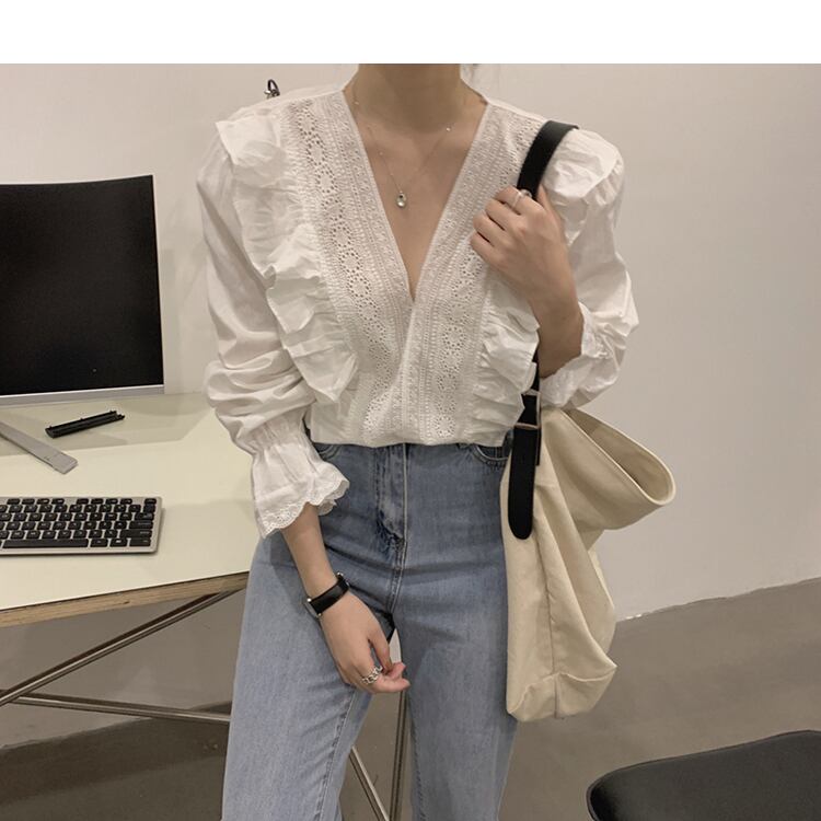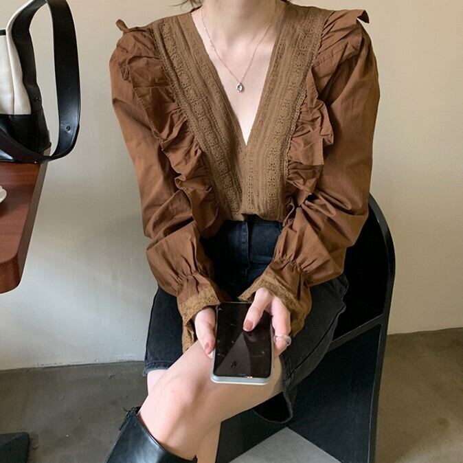 トップス シャツ ブラウス 長袖 無地 春 秋 フリル 前開き かわいい 大人可愛い きれいめ シンプル カジュアル 大人 上品 おしゃれ 大人女子 こなれ感 キュート ガーリー 抜け感 Vネック ボリューム袖 白シャツ 白 ホワイト 茶色 ブラウン S M L XL 大きいサイズ 10代 20代 30代 40代 50代 OL 通勤 学生 通学 デート お出かけ 女子会 着回し 普段使い 韓国系 ファッション コーデ スタイル 送料無料 | Rena 韓国ファッション レディースアパレル
