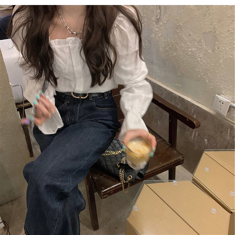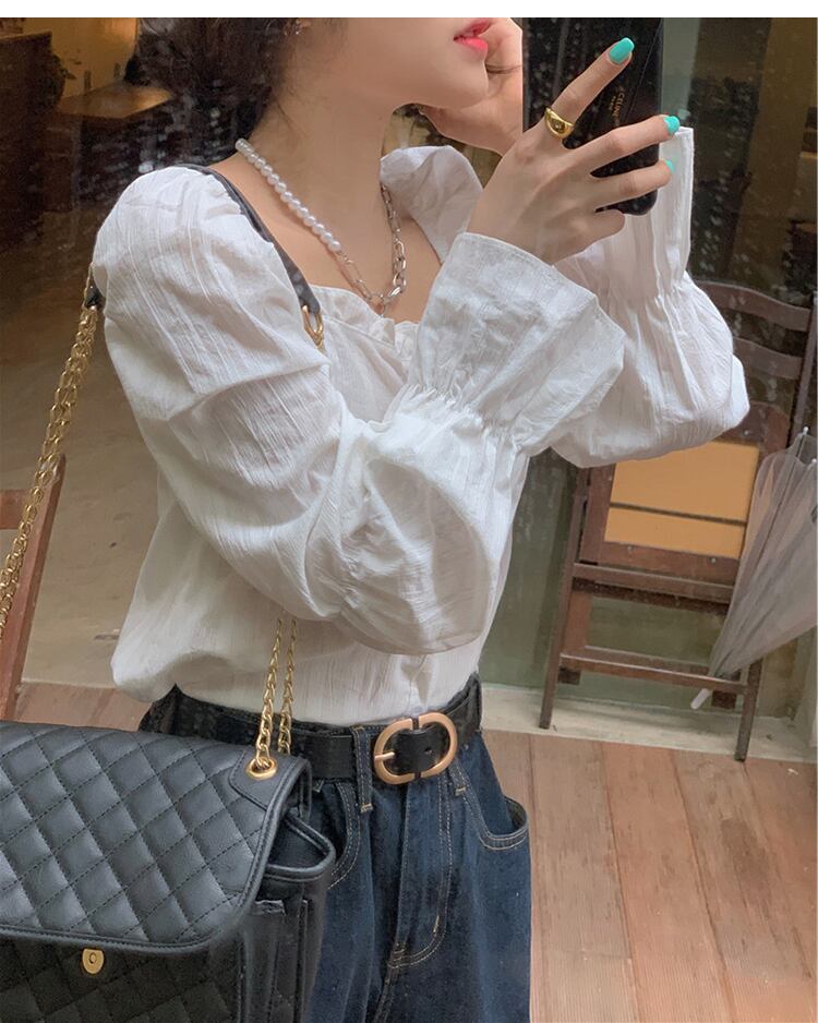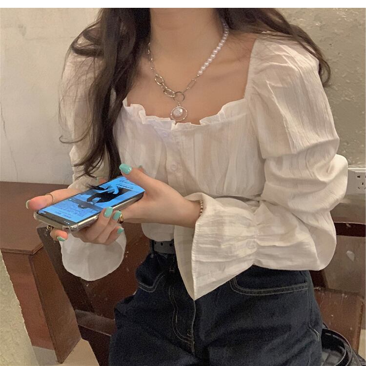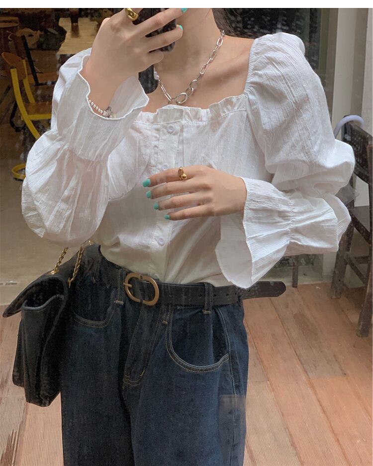 トップス シャツ ブラウス 長袖 無地 春 秋 フリル 透け感 かわいい 大人可愛い きれいめ シンプル カジュアル 大人 上品 おしゃれ 大人女子 スクエアネック 袖あり ボリューム袖 パフスリーブ 白シャツ 白トップス 白 ホワイト S M L XL 大きいサイズ 10代 20代 30代 40代 OL 通勤 学生 通学 デート お出かけ 女子会 着回し 普段使い ファッション コーデ 送料無料 | Rena 韓国ファッション レディースアパレル