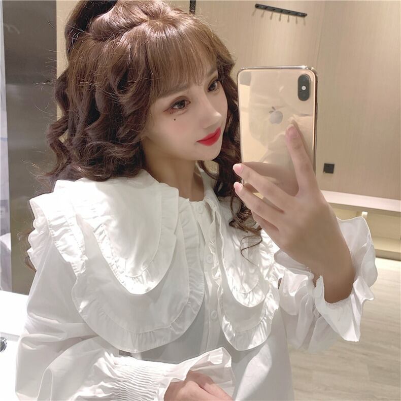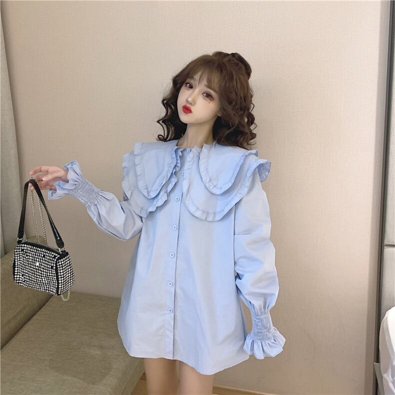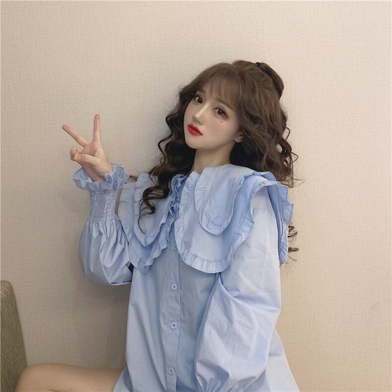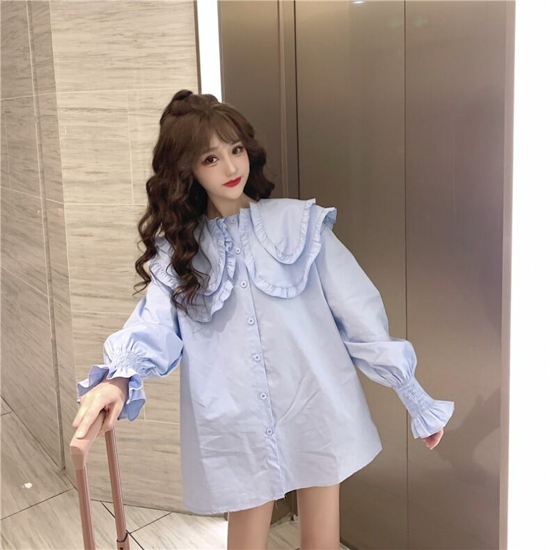 トップス シャツ ブラウス 長袖 無地 春 秋 フリル 前開き かわいい 大人可愛い きれいめ シンプル カジュアル 大人 上品 おしゃれ 大人女子 ラブリー キュート ガーリー 襟付き ボリューム袖 白シャツ 白 ホワイト 水色 フリーサイズ ビッグサイズ ゆったり ゆる 10代 20代 30代 40代 OL 通勤 学生 通学 デート お出かけ 女子会 着回し 普段使い ファッション コーデ 送料無料 | Rena 韓国ファッション レディースアパレル