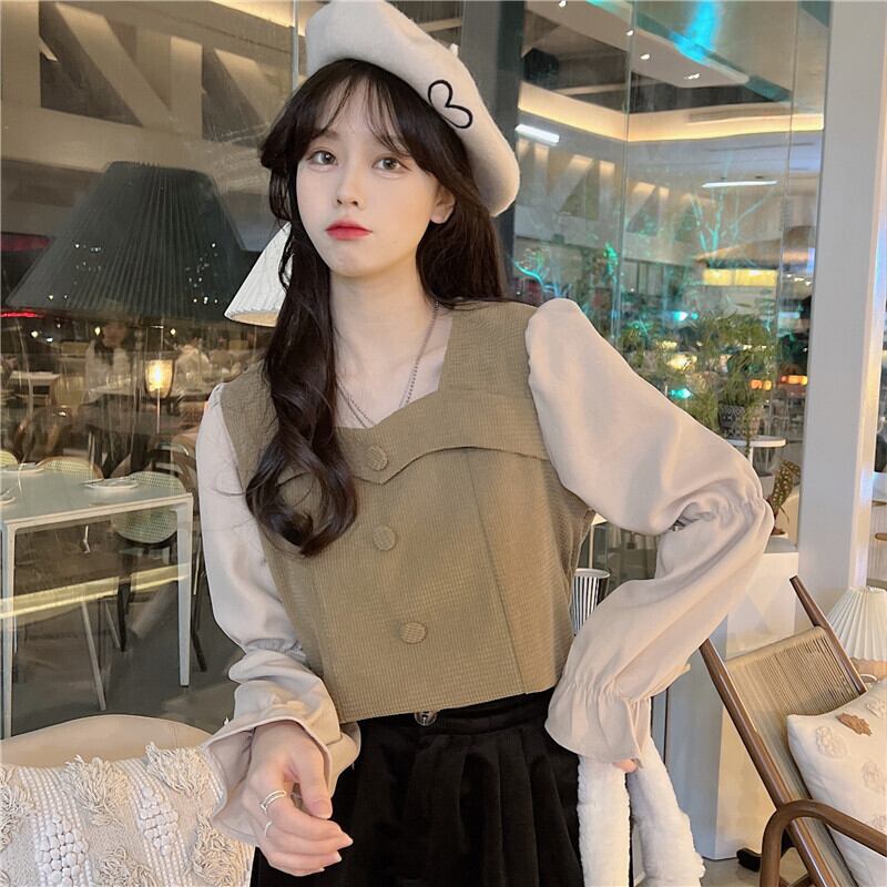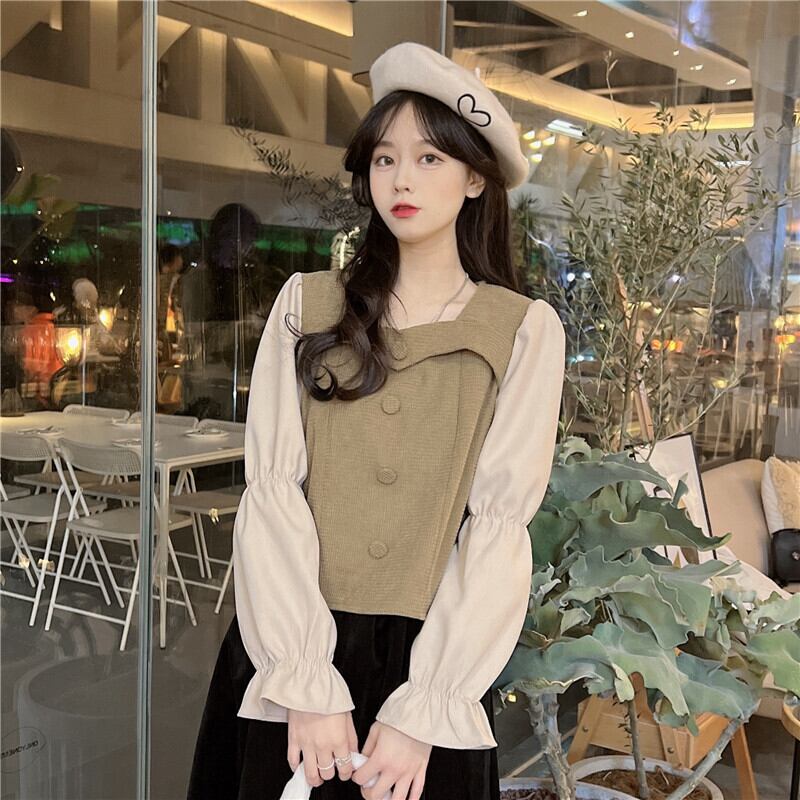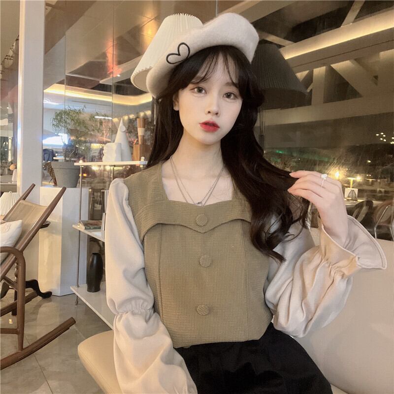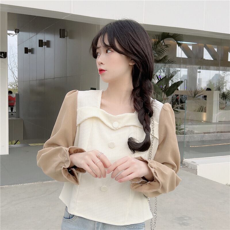 トップス シャツ ブラウス 長袖 無地 春 秋 切り替えデザイン ドッキング かわいい 大人可愛い きれいめ シンプル カジュアル 大人 上品 おしゃれ 大人女子 キュート ガーリー スクエアネック 襟なし ボリューム袖 白トップス 白 ホワイト カーキ S M L 10代 20代 30代 40代 OL 通勤 学生 通学 デート お出かけ 女子会 着回し 普段使い 韓国系 ファッション コーデ 送料無料 | Rena 韓国ファッション レディースアパレル