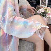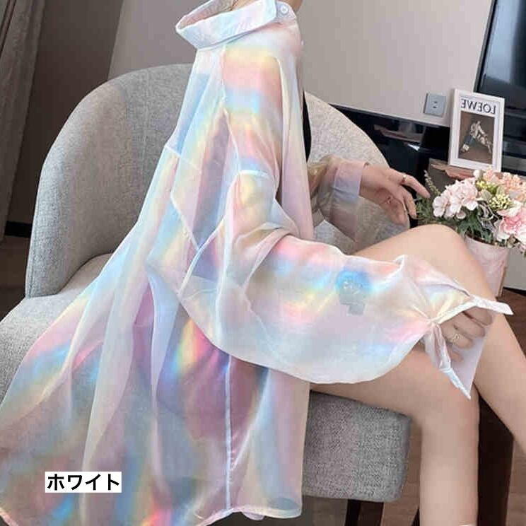 トップス レディース ブラウス ロング丈 長袖 柄 レインボー 春 夏 セミフレア スリム ストレート 前開き 透け感 シースルー かわいい 大人可愛い きれいめ シンプル カジュアル 大人 上品 おしゃれ お洒落 レトロ 大人可愛い 大人女子 ガーリー セクシー エレガント とろみ感 Vネック ロング 袖あり パステルカラー くすみカラー S M L XL 20代 30代 通学 デート お出かけ 女子会 休日 着回し 普段使い 重ね着 お揃い オルチャン コーデ 送料無料 トレンド インスタ映え | Rena 韓国ファッション レディースアパレル