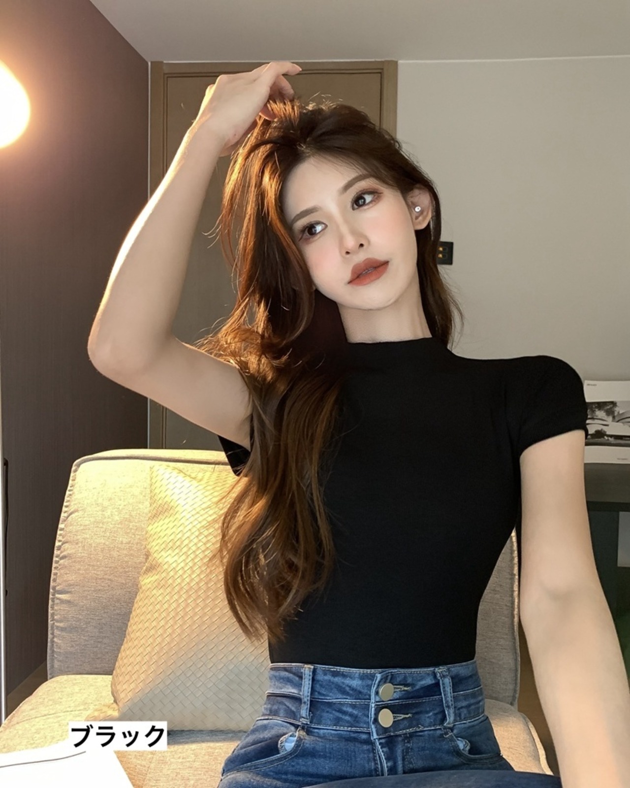 トップス レディース カットソー 半袖 無地 春 夏 スリム タイト 細身 伸縮性 かわいい 大人可愛い きれいめ シンプル カジュアル 大人 上品 おしゃれ お洒落 レトロ 大人可愛い 大人女子 個性的 セクシー ハイネック 袖あり 白 ホワイト 黒 ブラック 青 ブルー 灰色 グレー 大人カラー アプリコット ワンサイズ 20代 30代 オフィス ビジネス 学生 通学 デート お出かけ 女子会 休日 着回し 普段使い 韓国 韓国系 オルチャン モテ 送料無料 トレンド 流行 インスタ映え | Rena 韓国ファッション レディースアパレル