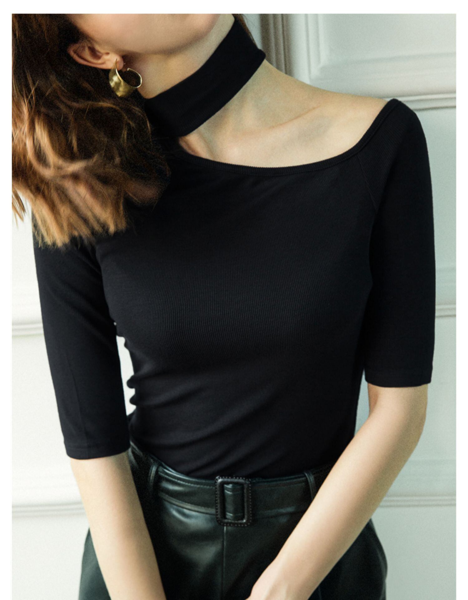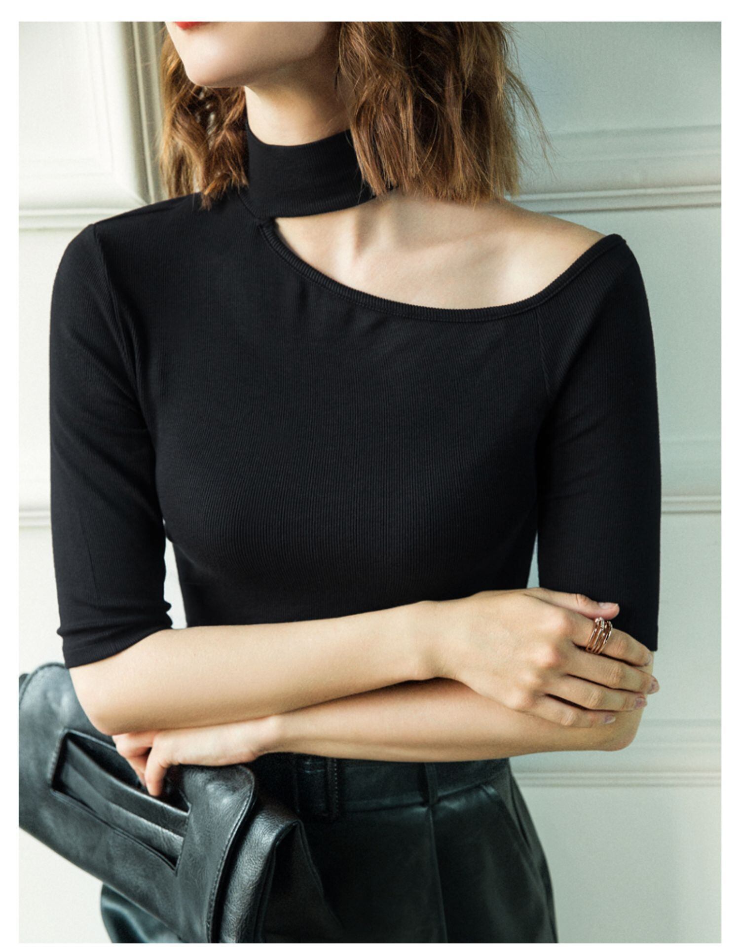 トップス カットソー 五分袖 無地 春 夏 秋 スリム 細身 アシンメトリー 大人可愛い きれいめ シンプル カジュアル 大人 上品 おしゃれ かっこいい 大人女子 クール モード系 5分袖 黒 ブラック モノトーン S M L XL 2XL 大きいサイズ 10代 20代 30代 40代 オフィス ビジネス OL 通勤 学生 通学 デート お出かけ 女子会 着回し 普段使い ファッション コーデ 送料無料 | Rena 韓国ファッション レディースアパレル