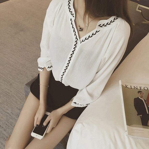 トップス レディース ブラウス 七分袖 無地 春 夏 スリム ストレート フリル かわいい 大人可愛い きれいめ シンプル カジュアル 大人 上品 おしゃれ お洒落 レトロ 大人女子 こなれ感 ラフ キュート 個性的 クール とろみ感 Vネック 袖あり 白 ホワイト 黒 ブラック 大人カラー M L XL 2XL 3XL 4XL 20代 30代 学生 通学 デート お出かけ 女子会 休日 着回し 普段使い 韓国 韓国系 オルチャン コーデ スタイル モテ 送料無料 トレンド 流行 インスタ映え | Rena 韓国ファッション レディースアパレル
