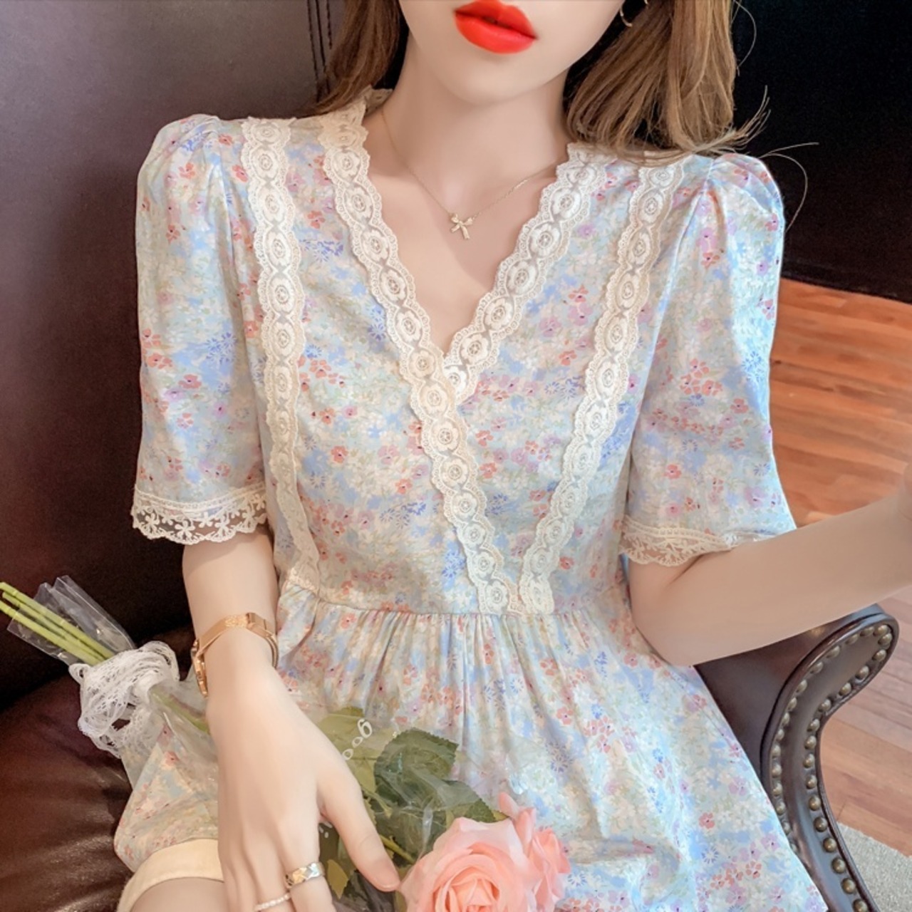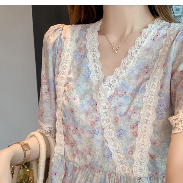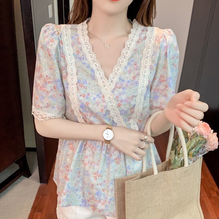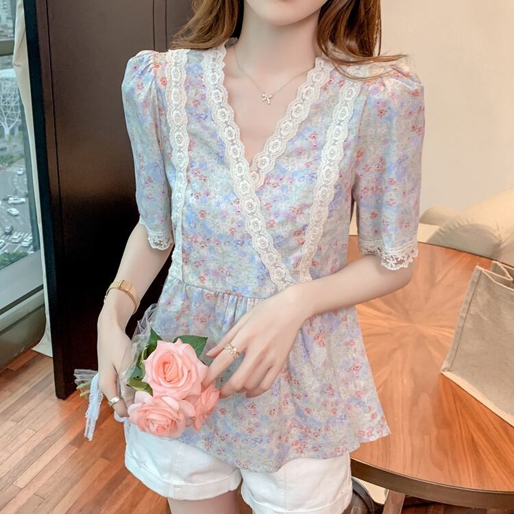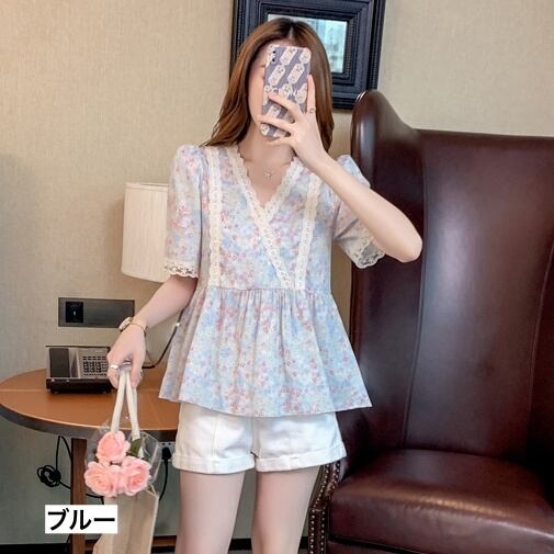 トップス レディース シャツ 半袖 柄 花柄 小花柄 フラワー 春 夏 秋 セミフレア かわいい 大人可愛い きれいめ シンプル カジュアル 大人 上品 おしゃれ お洒落 レトロ アジアン エキゾチック 大人可愛い 大人女子 こなれ感 Vネック 袖あり 青 ブルー ピンク くすみカラー 大人カラー S M L XL 20代 30代 お出かけ 女子会 休日 着回し 普段使い 韓国 韓国系 オルチャン ファッション コーデ スタイル モテ 送料無料 トレンド 流行 インスタ映え | Rena 韓国ファッション レディースアパレル
