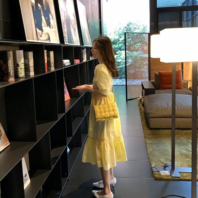 柔らかいイエローの色味がかわいらしい、ミドル丈ワンピースです。