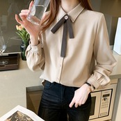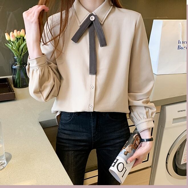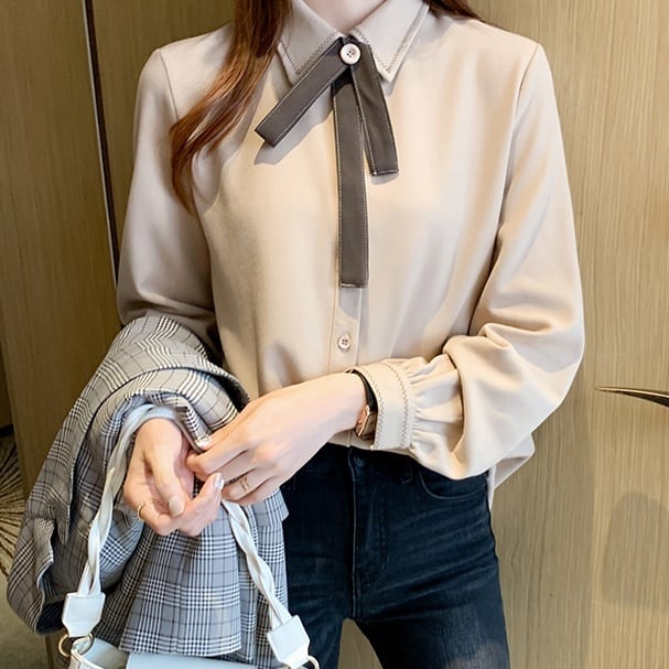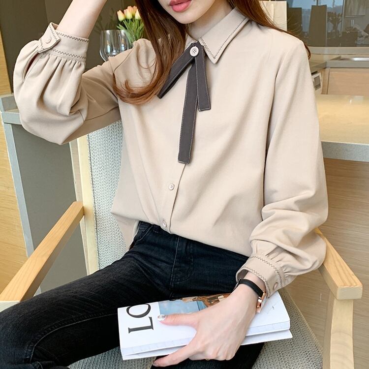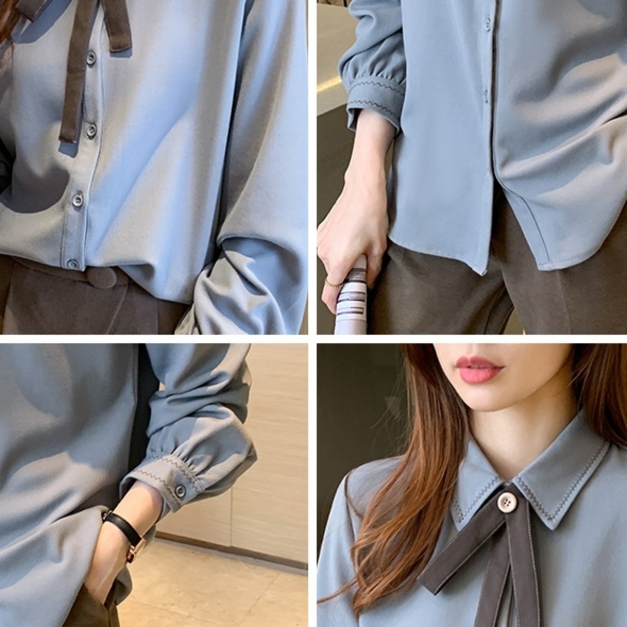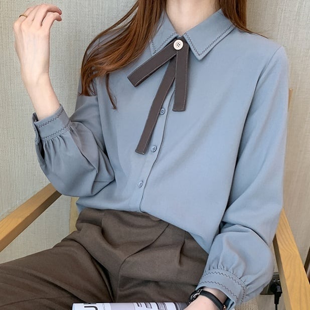 トップス レディース ブラウス 長袖 無地 春 夏 秋 スリム リボン 前開き かわいい 大人可愛い きれいめ シンプル カジュアル 大人 上品 おしゃれ お洒落 レトロ 大人女子 こなれ感 エレガント 襟付き 袖あり 青 ブルー ベージュ くすみカラー 大人カラー S M L XL 2XL 20代 30代 オフィス ビジネス 通勤 学生 通学 デート お出かけ 女子会 休日 着回し 普段使い 韓国 韓国系 オルチャン ファッション コーデ スタイル モテ 送料無料 トレンド 流行 インスタ映え | Rena 韓国ファッション レディースアパレル