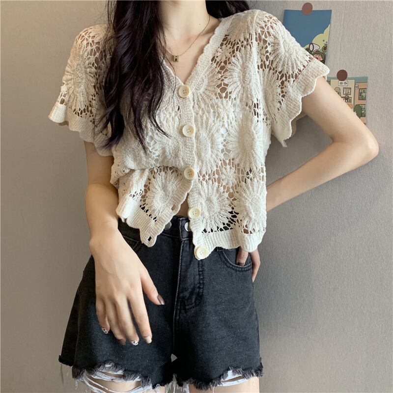 トップス レディース カーディガン ショート丈 半袖 フラワー 春 夏 秋 ストレート レース 前開き かわいい 大人可愛い きれいめ シンプル カジュアル 大人 上品 おしゃれ お洒落 レトロ 大人女子 こなれ感 キュート ガーリー 個性的 Vネック 袖あり 白 ホワイト くすみカラー ワンサイズ 20代 30代 デート お出かけ 女子会 休日 アウトドア 旅行 着回し 普段使い 韓国 韓国系 オルチャン ファッション コーデ スタイル モテ 送料無料 トレンド 流行 インスタ映え | Rena 韓国ファッション レディースアパレル