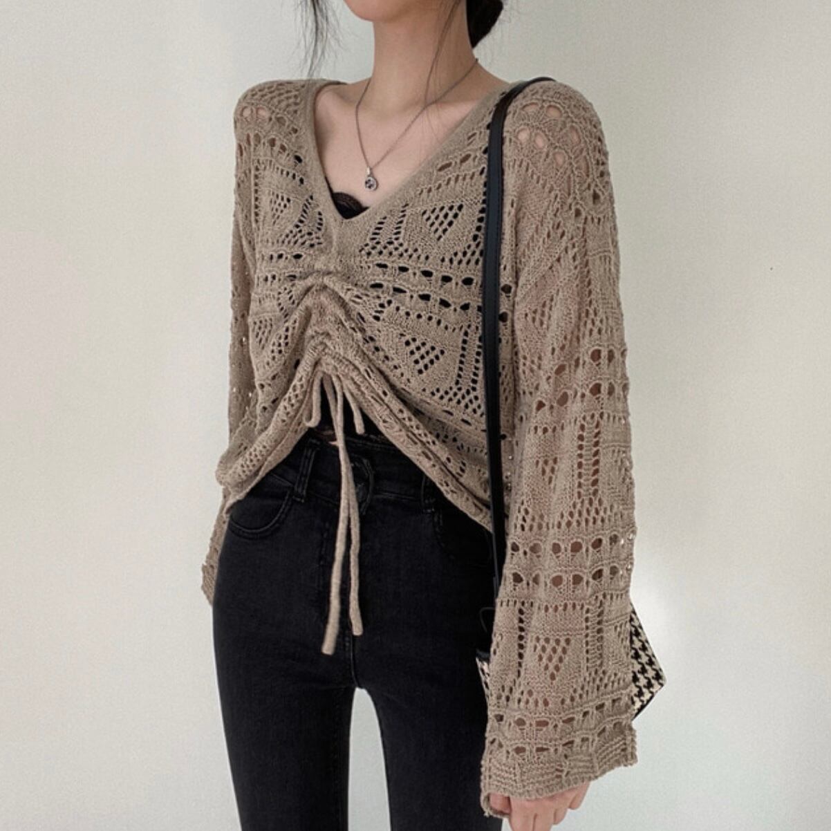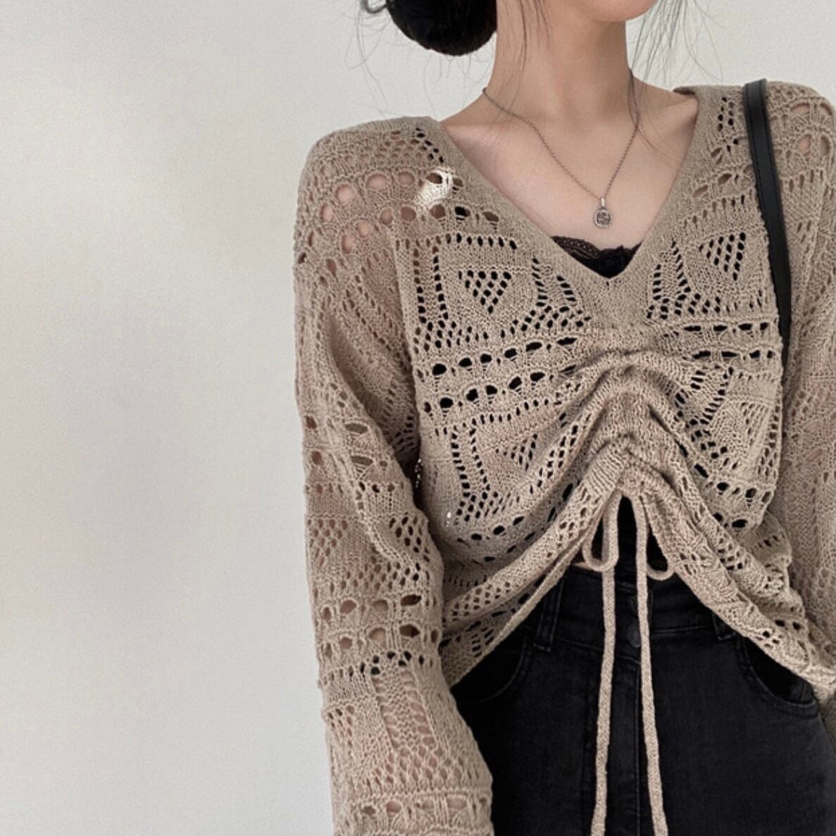 トップス レディース ニット ショート丈 長袖 無地 春 秋 冬 ストレート ケーブルニット 透け感 かわいい 大人可愛い きれいめ シンプル カジュアル 大人 上品 おしゃれ お洒落 レトロ 大人可愛い 大人女子 ラフ ルーズ 個性的 Vネック 袖あり 白 ホワイト 黒 ブラック カーキ 大人カラー ワンサイズ 20代 30代 デート お出かけ 公園デビュー 女子会 休日 着回し 普段使い 重ね着 韓国 韓国系 オルチャン ファッション コーデ スタイル 送料無料 トレンド 流行 インスタ映え | Rena 韓国ファッション レディースアパレル