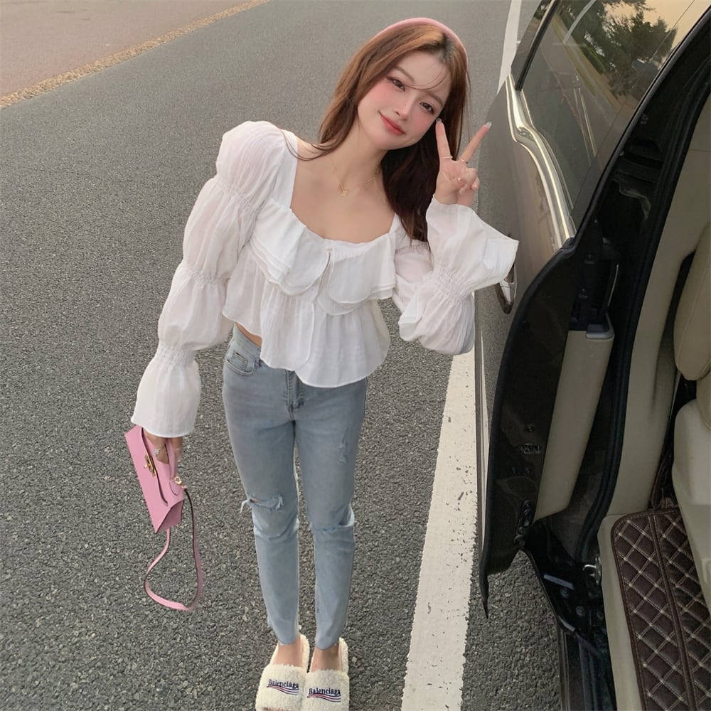 全体にあしらわれた大きなフリルが印象的な、デザイントップスです。