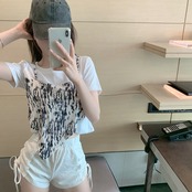 トップス レディース カットソー 半袖 柄 春 夏 秋 切り替えデザイン かわいい 大人可愛い きれいめ シンプル カジュアル 大人 上品 おしゃれ お洒落 レトロ 大人可愛い 大人女子 ラフ キュート 個性的 とろみ感 抜け感 Uネック 袖あり 黒 ブラック 青 ブルー くすみカラー S M L 20代 30代 学生 デート お出かけ 女子会 休日 旅行 着回し 普段使い 韓国 韓国系 オルチャン ファッション コーデ スタイル 楽ちん モテ プチプラ 送料無料 トレンド 流行 インスタ映え | Rena 韓国ファッション レディースアパレル