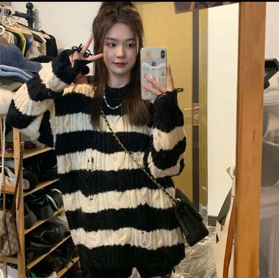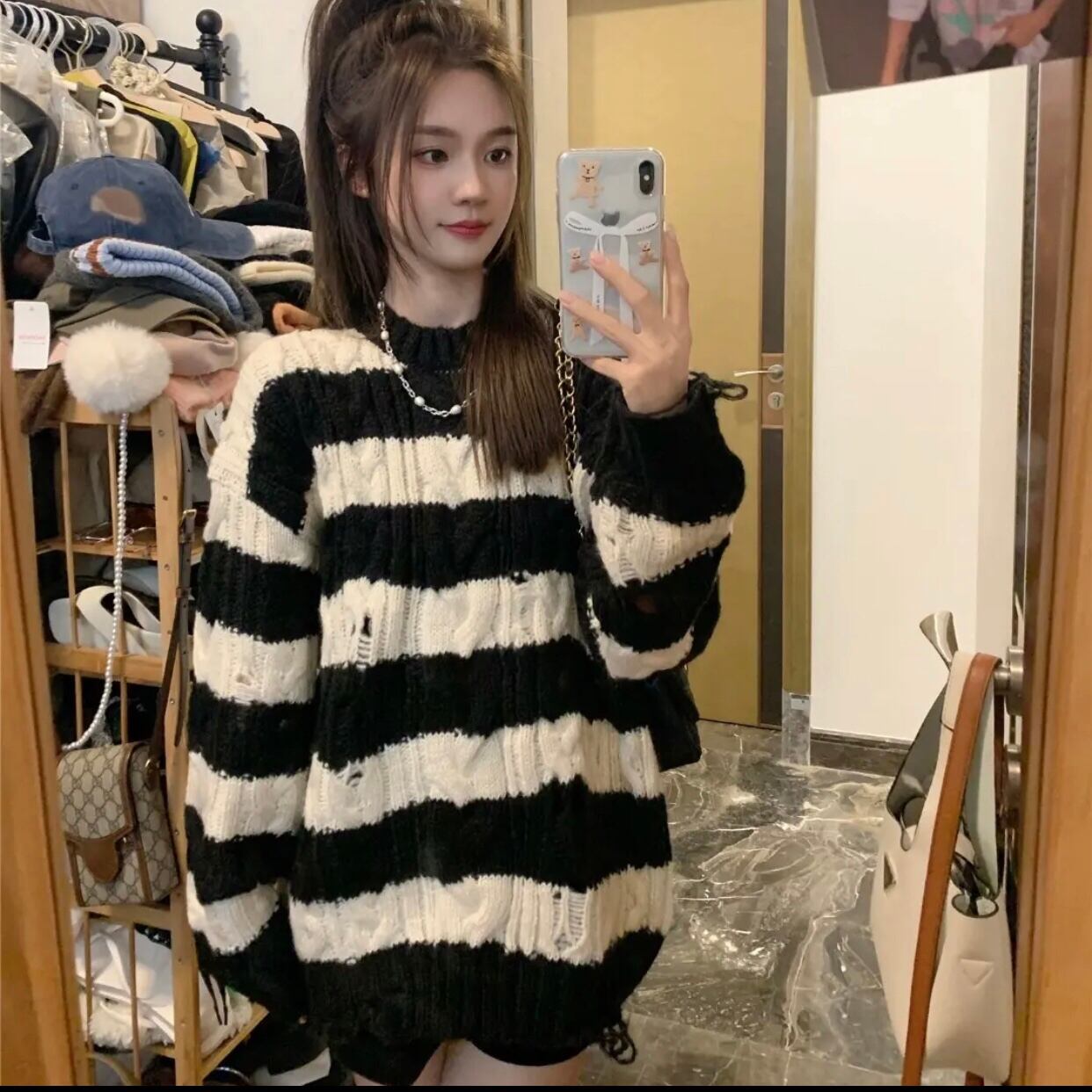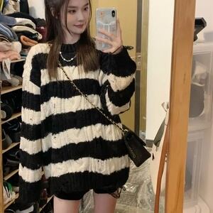 トップス レディース セーター ロング丈 長袖 ボーダー 秋 冬 ストレート ワイド 前開き かわいい 大人可愛い きれいめ シンプル カジュアル 大人 上品 おしゃれ お洒落 レトロ 大人可愛い 大人女子 こなれ感 ラフ キュート ルーズ 個性的 Uネック ロング 袖あり 黒 ブラック ピンク くすみカラー 大人カラー ベイクドカラー S M L XL 2XL ゆる 20代 30代 通学 デート 女子会 休日 アウトドア 着回し 普段使い 韓国 韓国系 プチプラ 送料無料 トレンド 流行 インスタ映え | Rena 韓国ファッション レディースアパレル