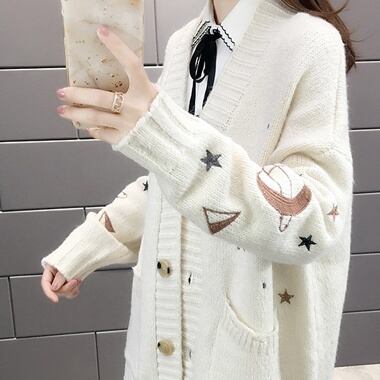 トップス レディース ニット カーディガン ミモレ丈 長袖 刺繍 春 秋 冬 ワイド ふわふわ 伸縮性 かわいい 大人可愛い きれいめ シンプル カジュアル 大人 上品 おしゃれ お洒落 かっこいい レトロ 大人女子 こなれ感 ラフ メンズライク キュート 個性的 袖あり 白 ホワイト 赤 レッド 青 ブルー くすみカラー S M L XL 20代 30代 学生 通学 デート お出かけ 公園デビュー 女子会 休日 着回し 普段使い 韓国 楽ちん モテ プチプラ 送料無料 トレンド 流行 インスタ映え | Rena 韓国ファッション レディースアパレル