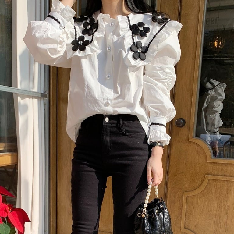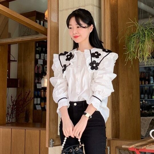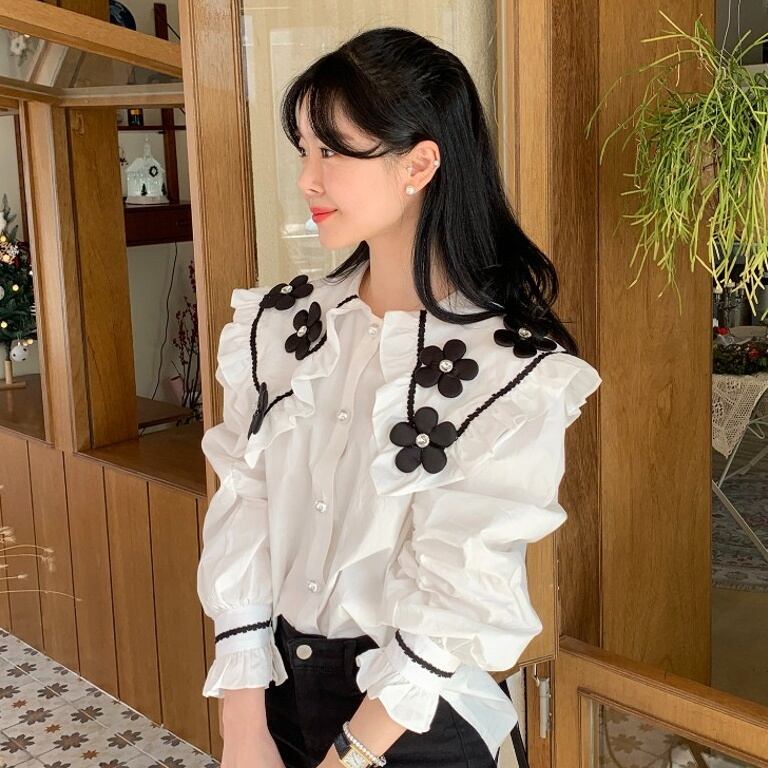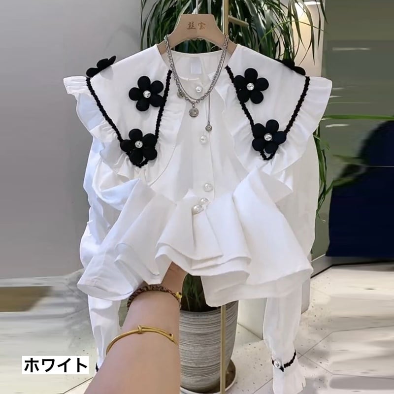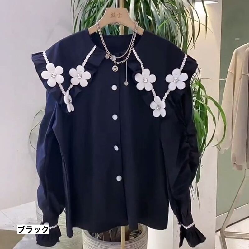 襟についた大きな花のモチーフがおしゃれな、デザインブラウスです。