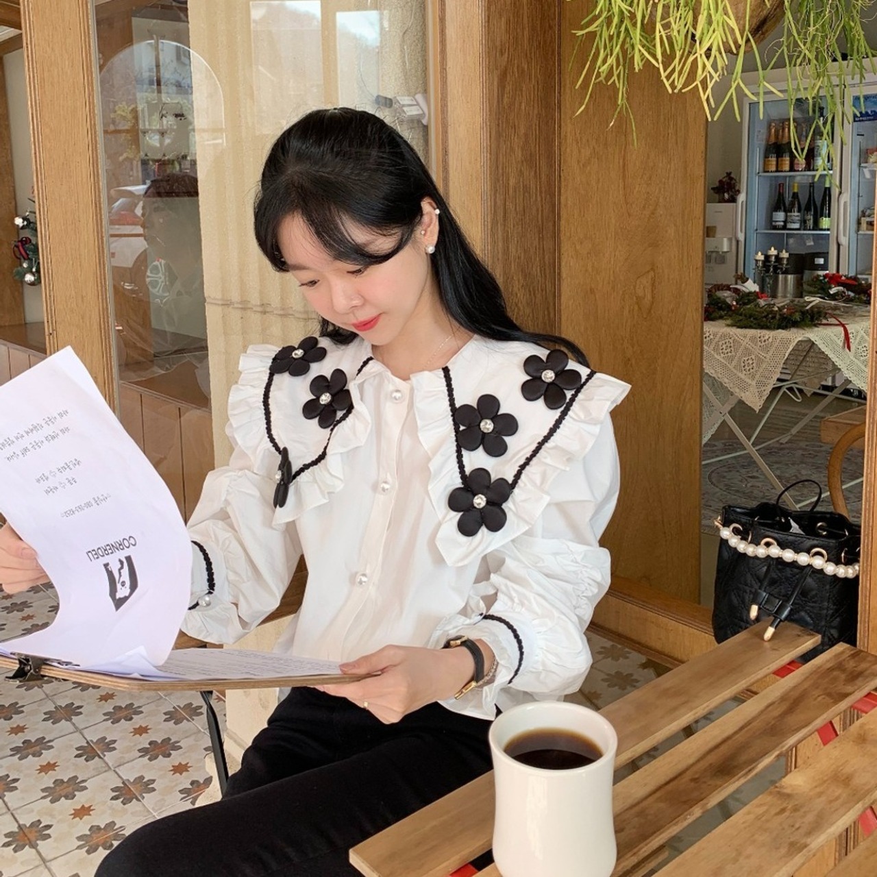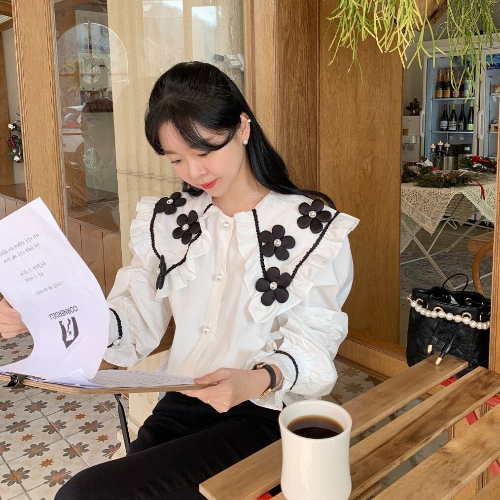 トップス レディース ブラウス 長袖 花柄 春 秋 冬 セミフレア レース フリル かわいい 大人可愛い きれいめ シンプル カジュアル 大人 上品 おしゃれ お洒落 レトロ 大人可愛い 大人女子 こなれ感 キュート ガーリー Vネック 袖あり 白 ホワイト ネイビー 大人カラー ベイクドカラー S M L XL 20代 30代 学生 通学 デート お出かけ 女子会 休日 着回し 普段使い 韓国 韓国系 オルチャン ファッション コーデ スタイル 送料無料 トレンド 流行 インスタ映え | Rena 韓国ファッション レディースアパレル