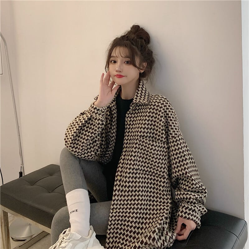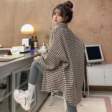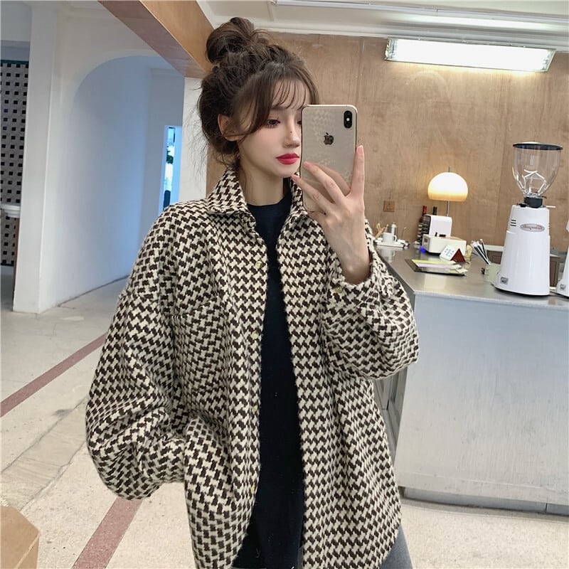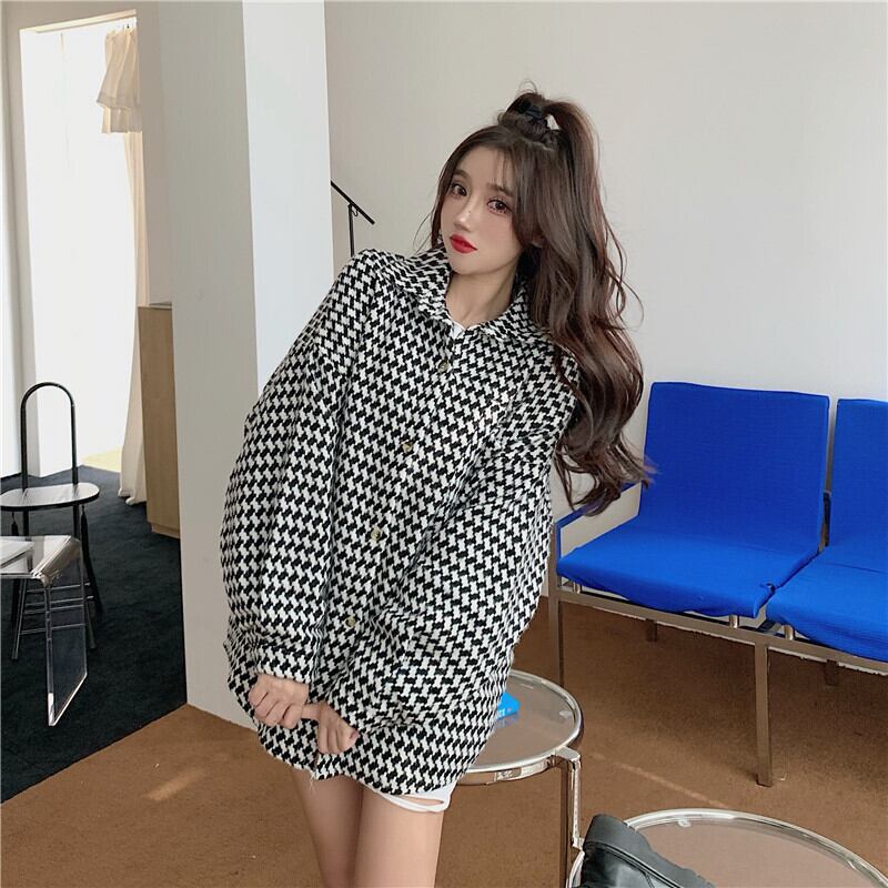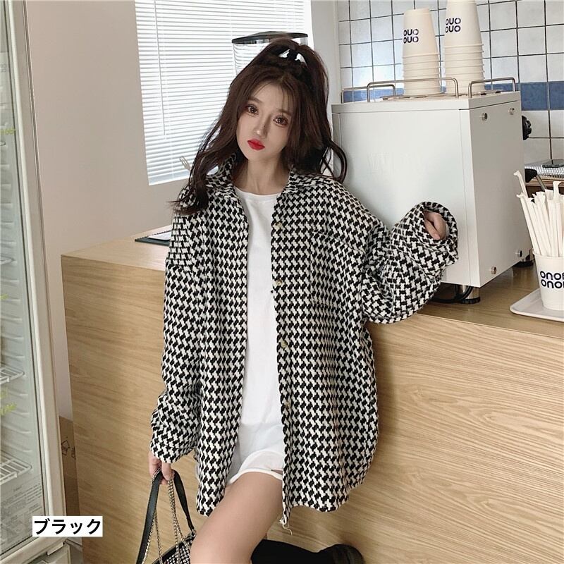 トップス レディース シャツ ロング丈 長袖 千鳥格子 春 秋 冬 ストレート ワイド 前開き かわいい 大人可愛い きれいめ シンプル カジュアル 大人 上品 おしゃれ お洒落 レトロ 大人可愛い 大人女子 こなれ感 キュート 袖あり 黒 ブラック 灰色 グレー くすみカラー 大人カラー ベイクドカラー M L XL ゆったり 20代 30代 通学 デート お出かけ 女子会 休日 着回し 普段使い 韓国 韓国系 オルチャン ファッション コーデ スタイル 送料無料 トレンド 流行 インスタ映え 即納 | Rena 韓国ファッション レディースアパレル