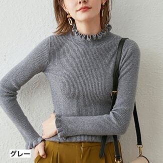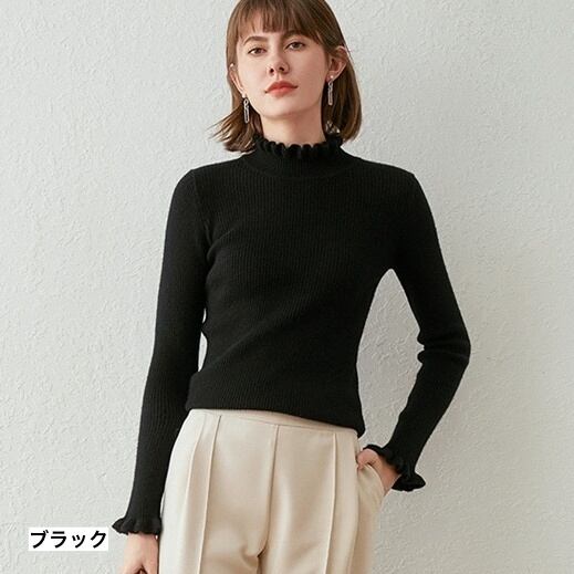 首元と袖口のリブ、フリルが可愛らしいハイネックセーターです。