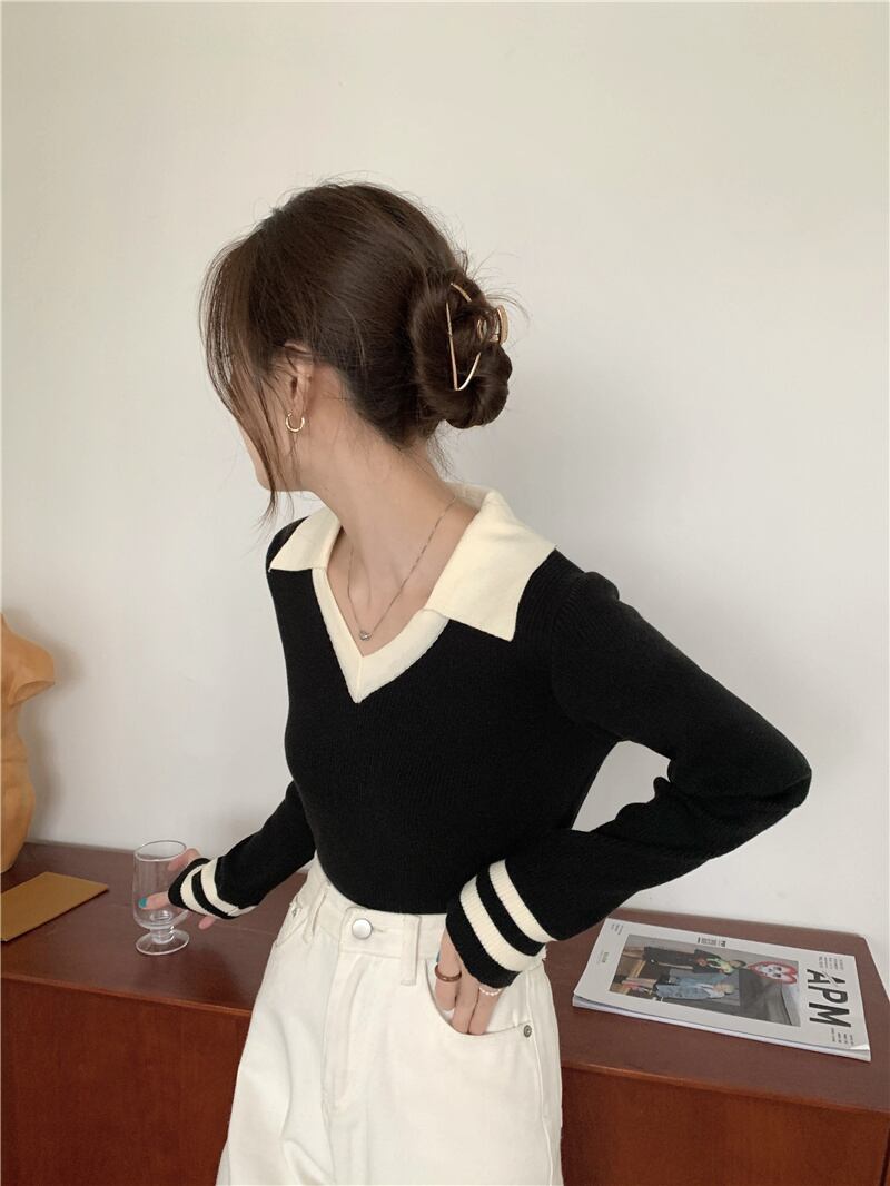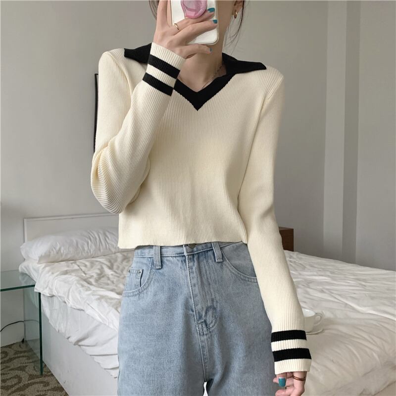 トップス レディース ニット ショート丈 長袖 無地 春 秋 冬 セミフレア かわいい 大人可愛い きれいめ シンプル カジュアル 大人 上品 おしゃれ お洒落 レトロ 大人可愛い 大人女子 ラフ キュート とろみ感 Vネック 襟付き ショート 袖あり 白 ホワイト 黒 ブラック 灰色 グレー ワンサイズ 20代 30代 オフィス 学生 デート お出かけ 休日 着回し 普段使い 重ね着 韓国 オルチャン ファッション コーデ スタイル 楽ちん あったか モテ 送料無料 トレンド 流行 インスタ映え | Rena 韓国ファッション レディースアパレル
