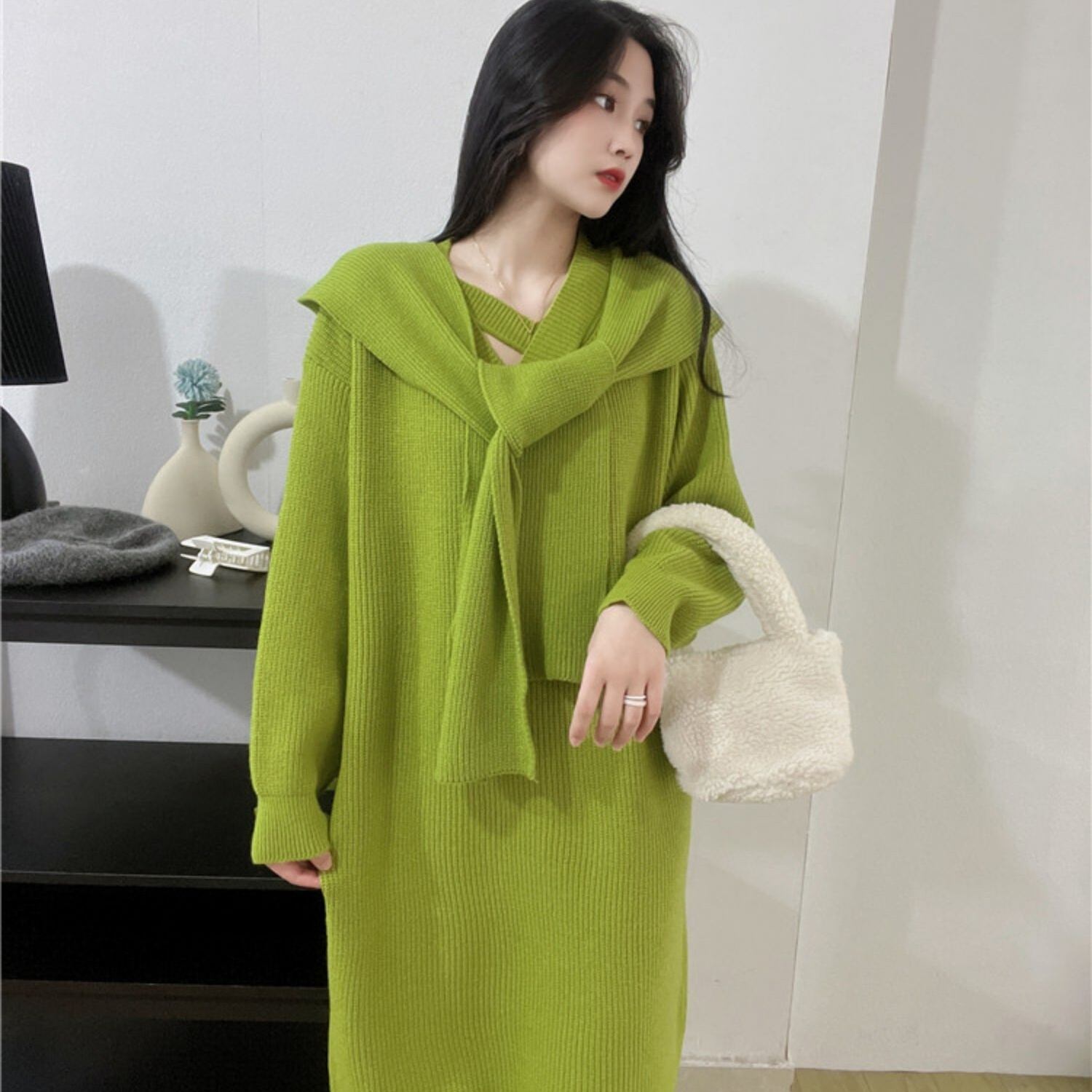これだけで寒い季節もおしゃれに決まる、ショール付きのニットワンピースです。