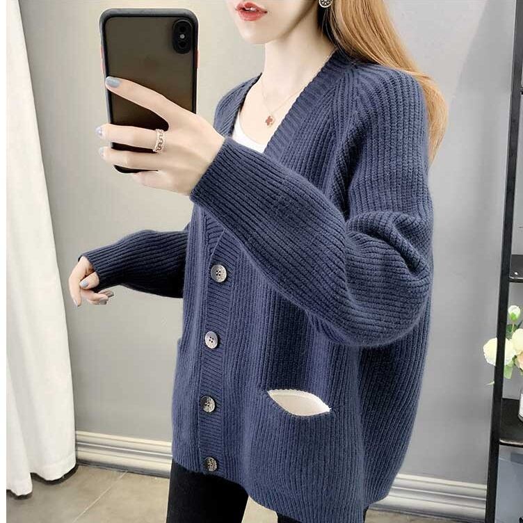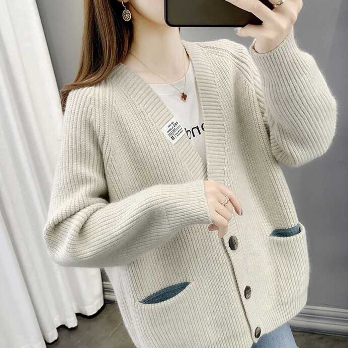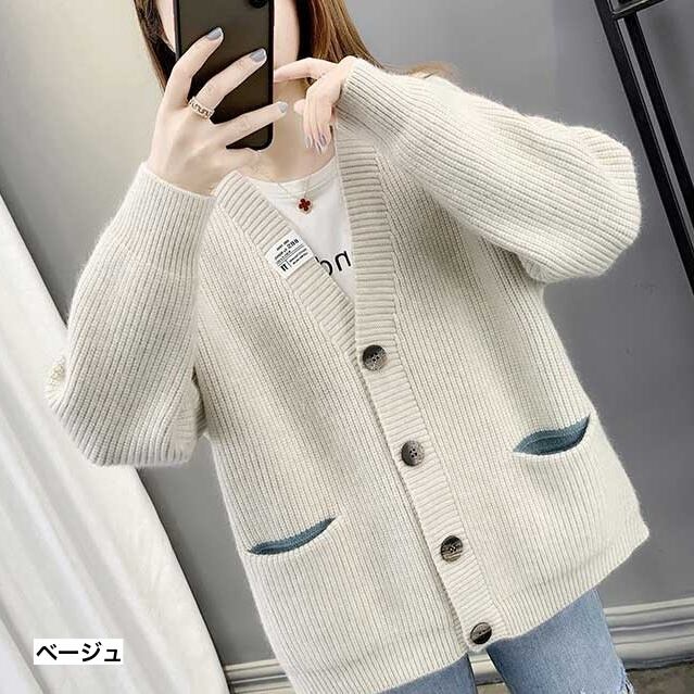 シンプルなデザインで、さまざまなコーディネートに取り入れやすいニットカーディガンです。