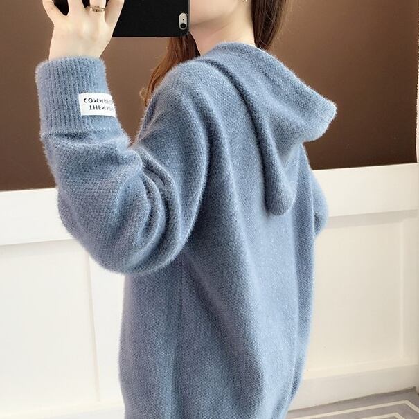 ふんわり感が可愛らしい、フード付きニットです。淡い色合いが可愛らしくて大人気。