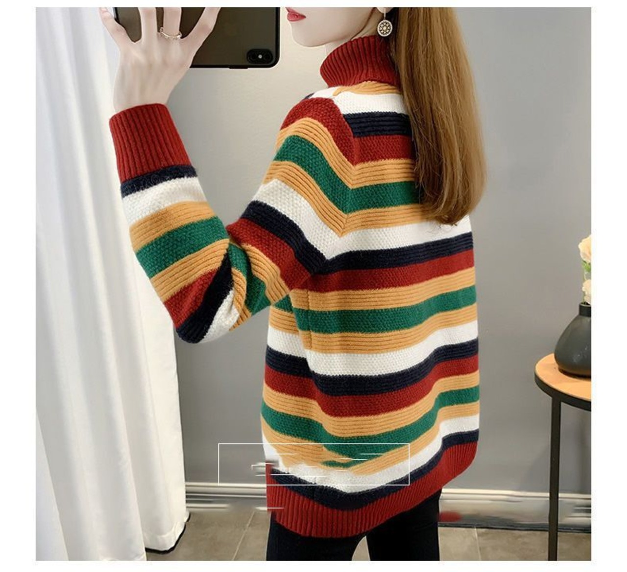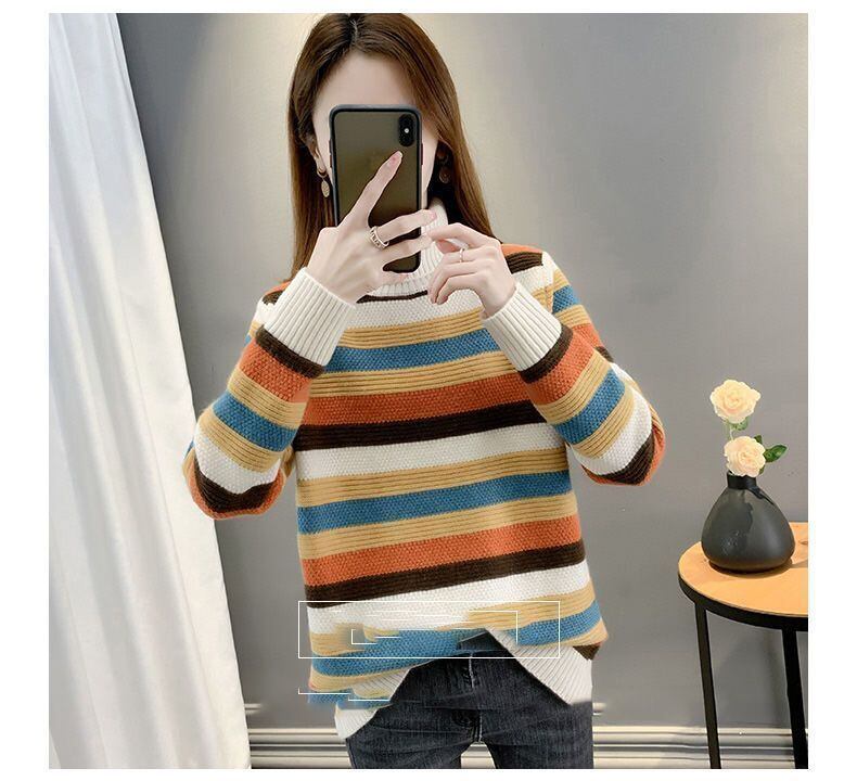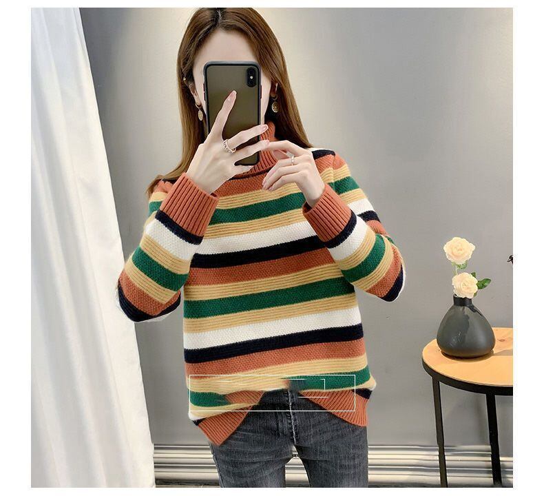 色使いがおしゃれで印象的な、ボーダーデザインのタートルネックニットです。